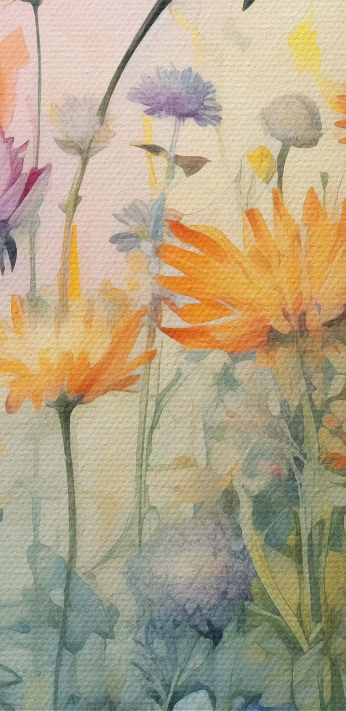 Wandbilder Ein lebhaftes Feld hoher und üppiger Wildblumen vor einem weichen, pastellfarbenen, aquarellartigen Hintergrund s42726