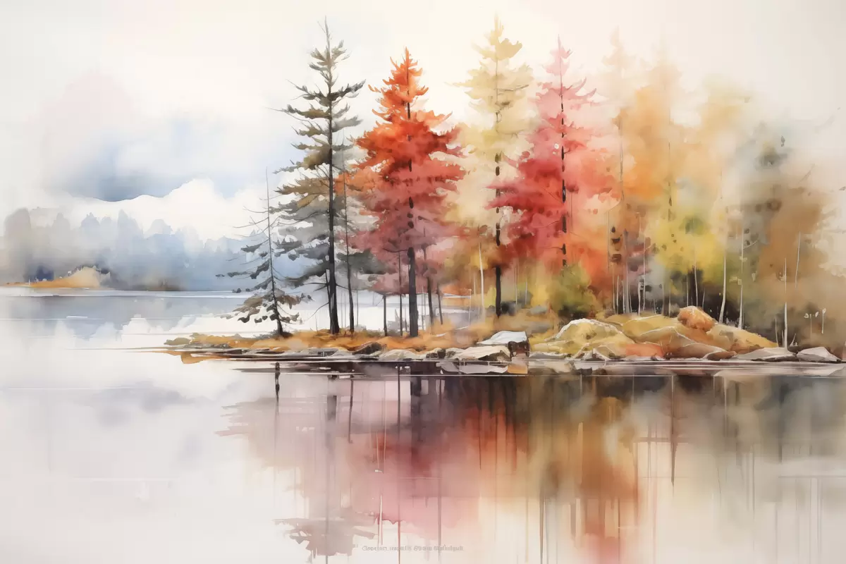 Wandbilder Aquarellartige Landschaft mit einem See, umgeben von Bäumen in leuchtenden Herbstfarben Art. s42727