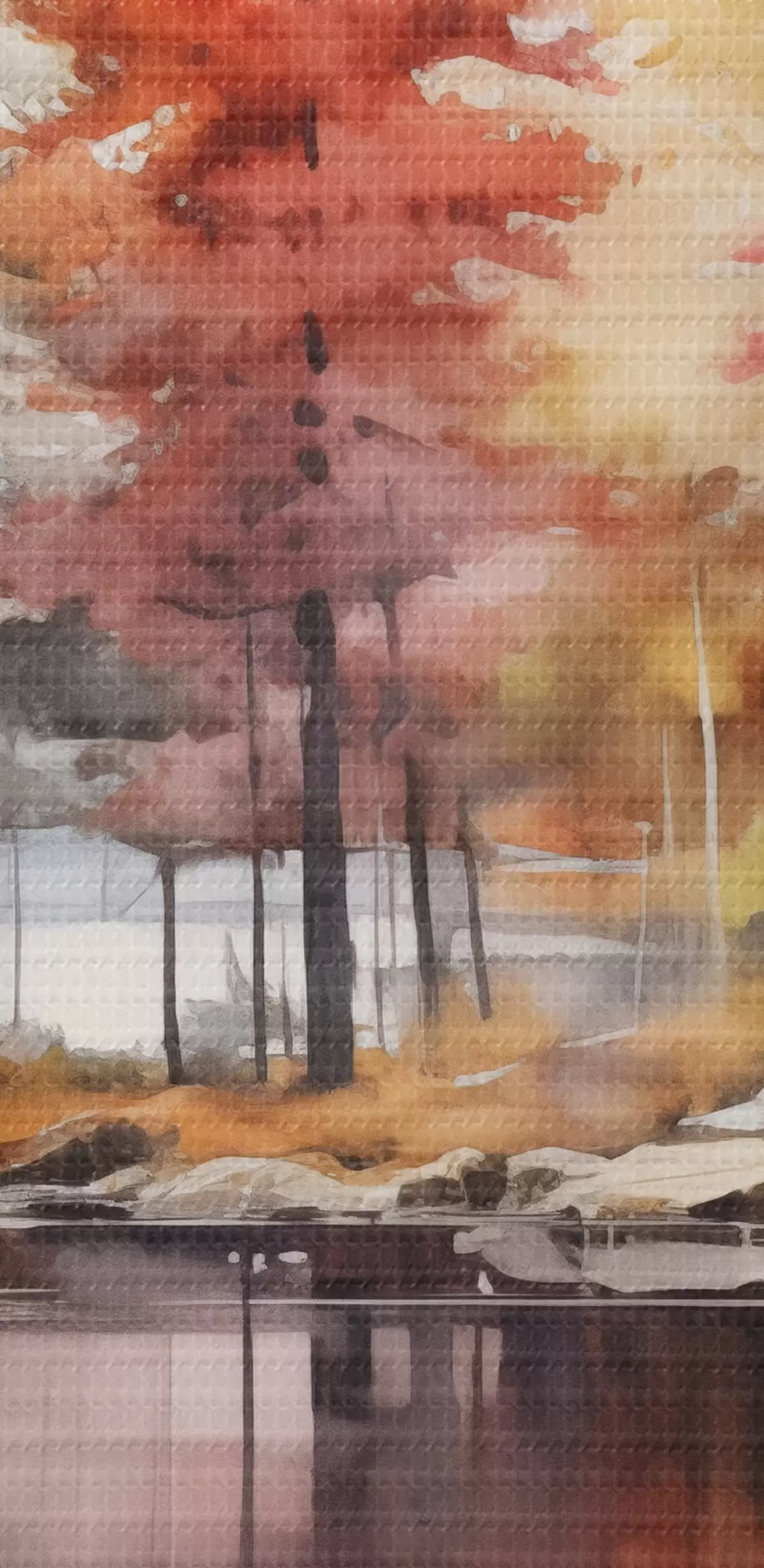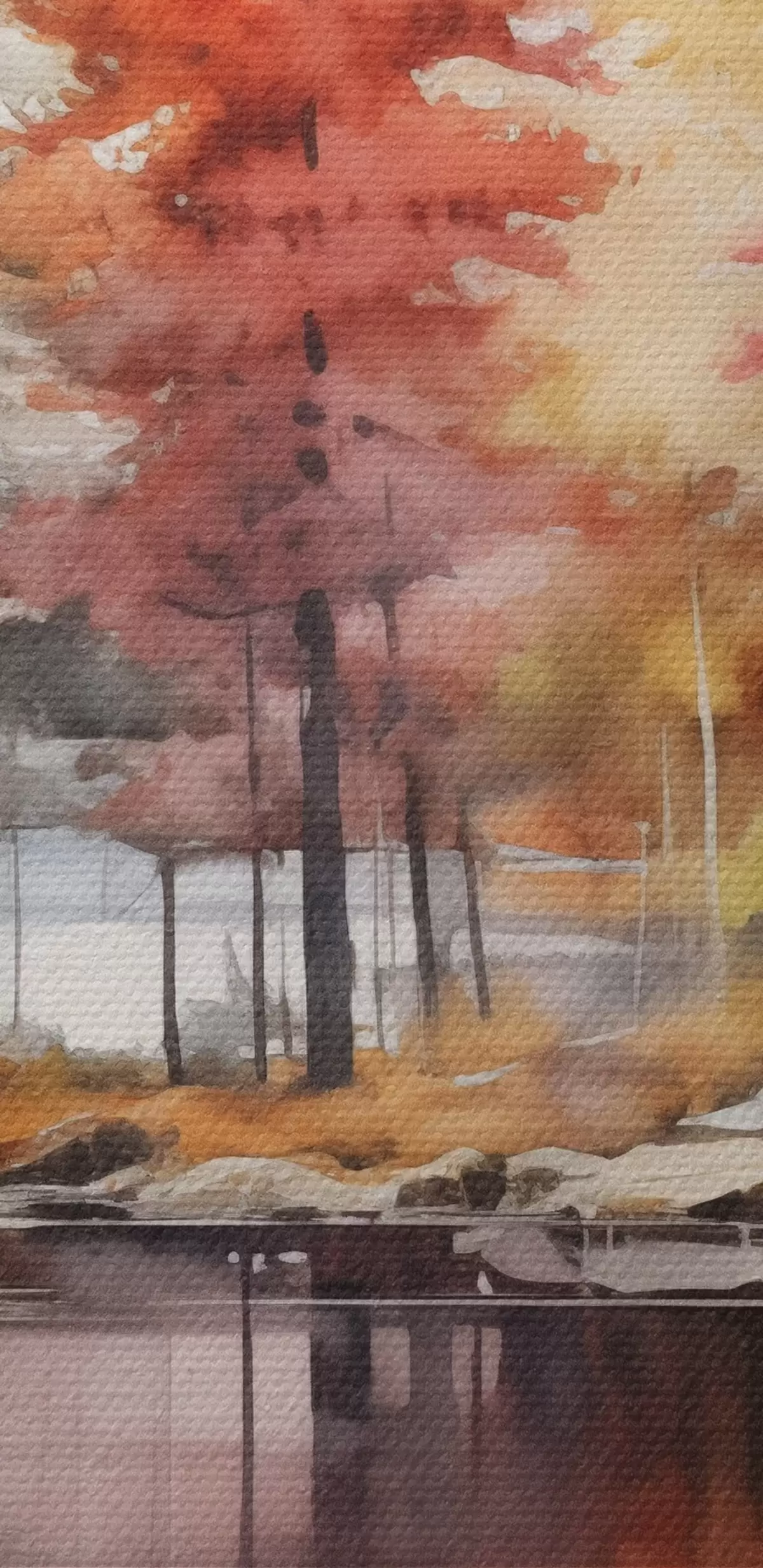 Wandbilder Aquarellartige Landschaft mit einem See, umgeben von Bäumen in leuchtenden Herbstfarben s42727