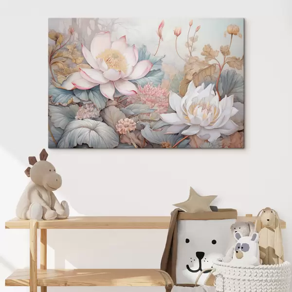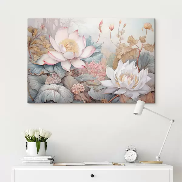 Wandbilder Große, blühende Lotosblüten in zarten Rosa- und Weißtönen, umgeben von grünen Blättern und zartrosa Laub Art. s42729