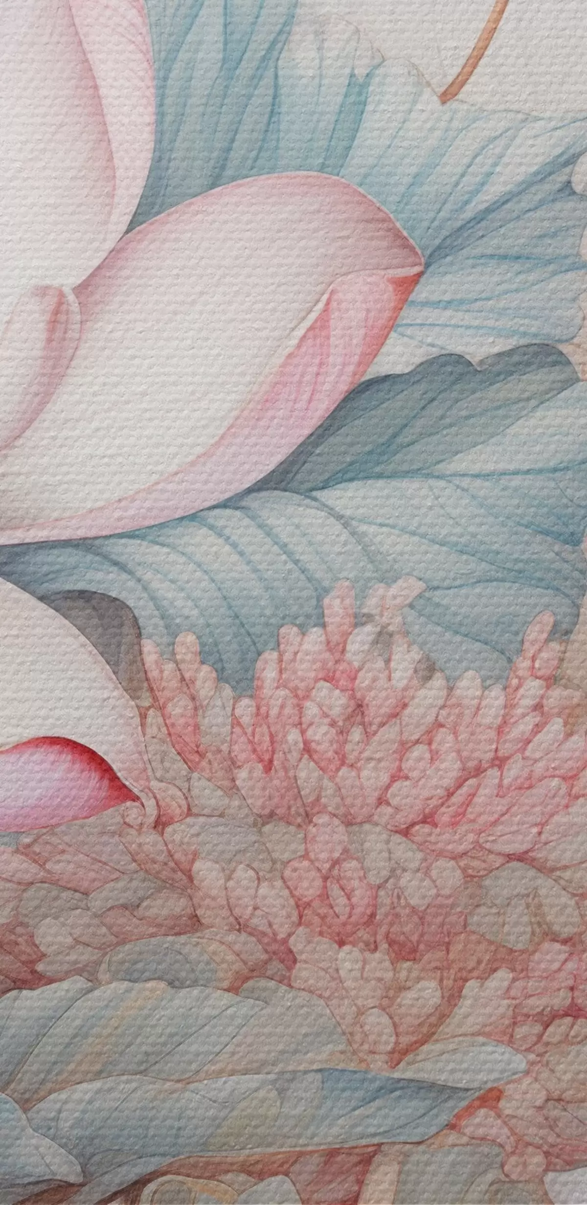 Wandbilder Große, blühende Lotosblüten in zarten Rosa- und Weißtönen, umgeben von grünen Blättern und zartrosa Laub s42729
