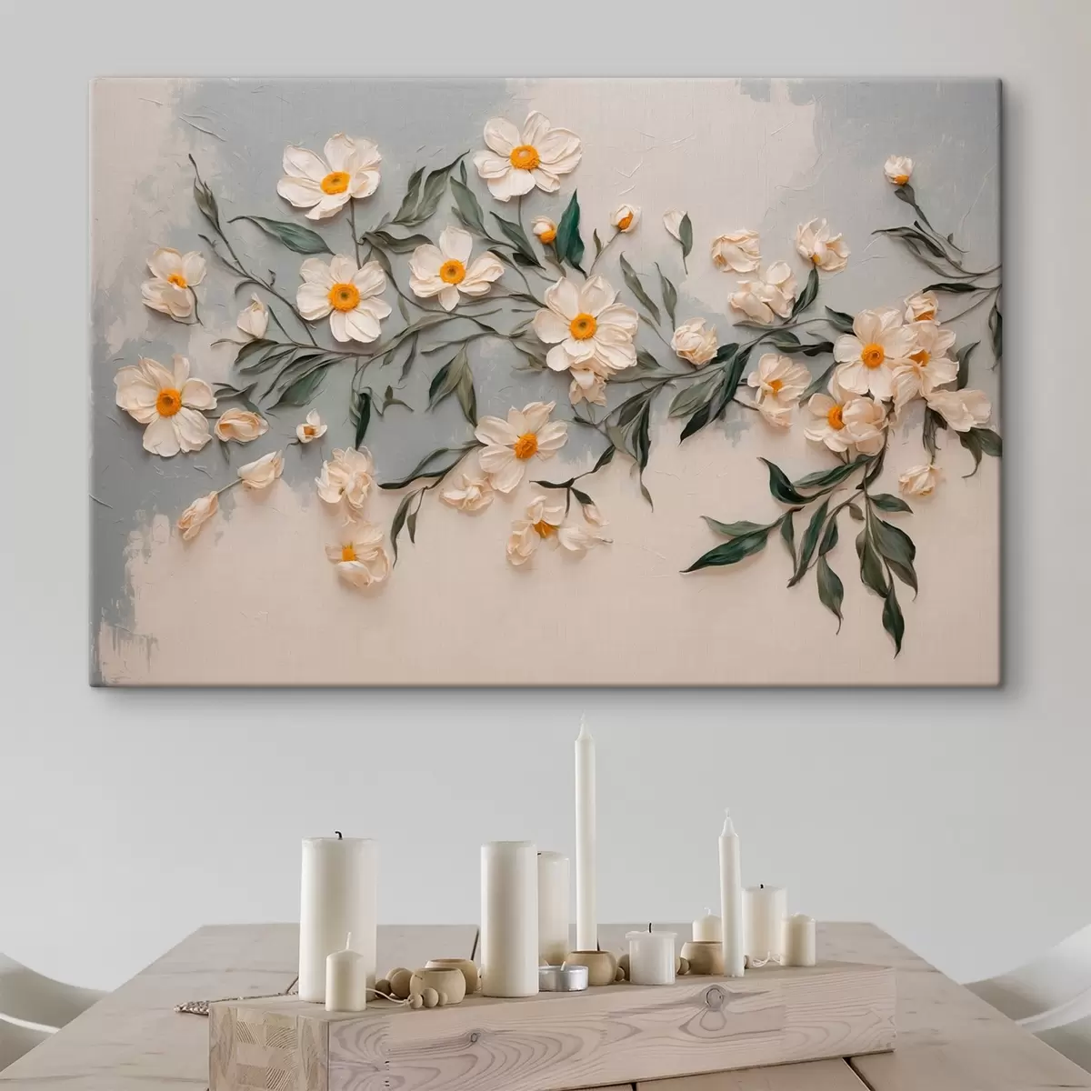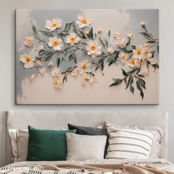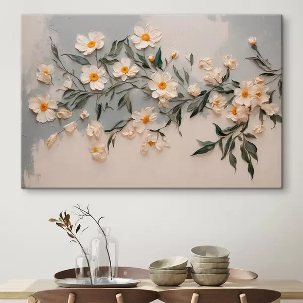 Wandbilder Weiße Blumen und Blätter auf weißem und grauem Hintergrund Art. s42764