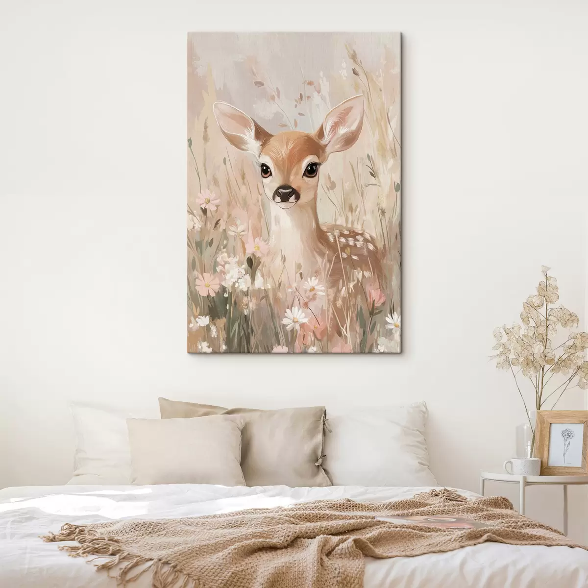 Wandbilder Kleines Reh auf der Sommerwiese, Acryl-Stil drawimg, Pastell rosa und beige Farben Art. s42781