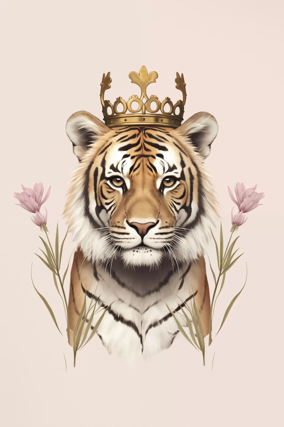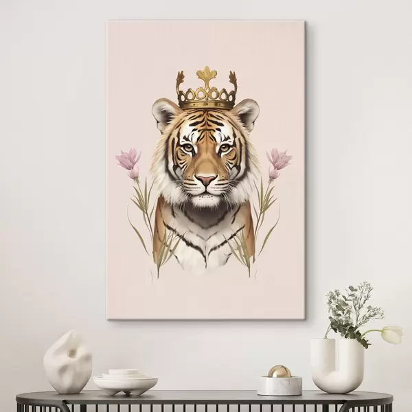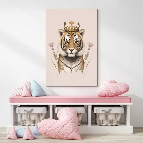 Wandbilder Tiger mit Krone, rosa Hintergrund, Tulpenblüten Art. s42782