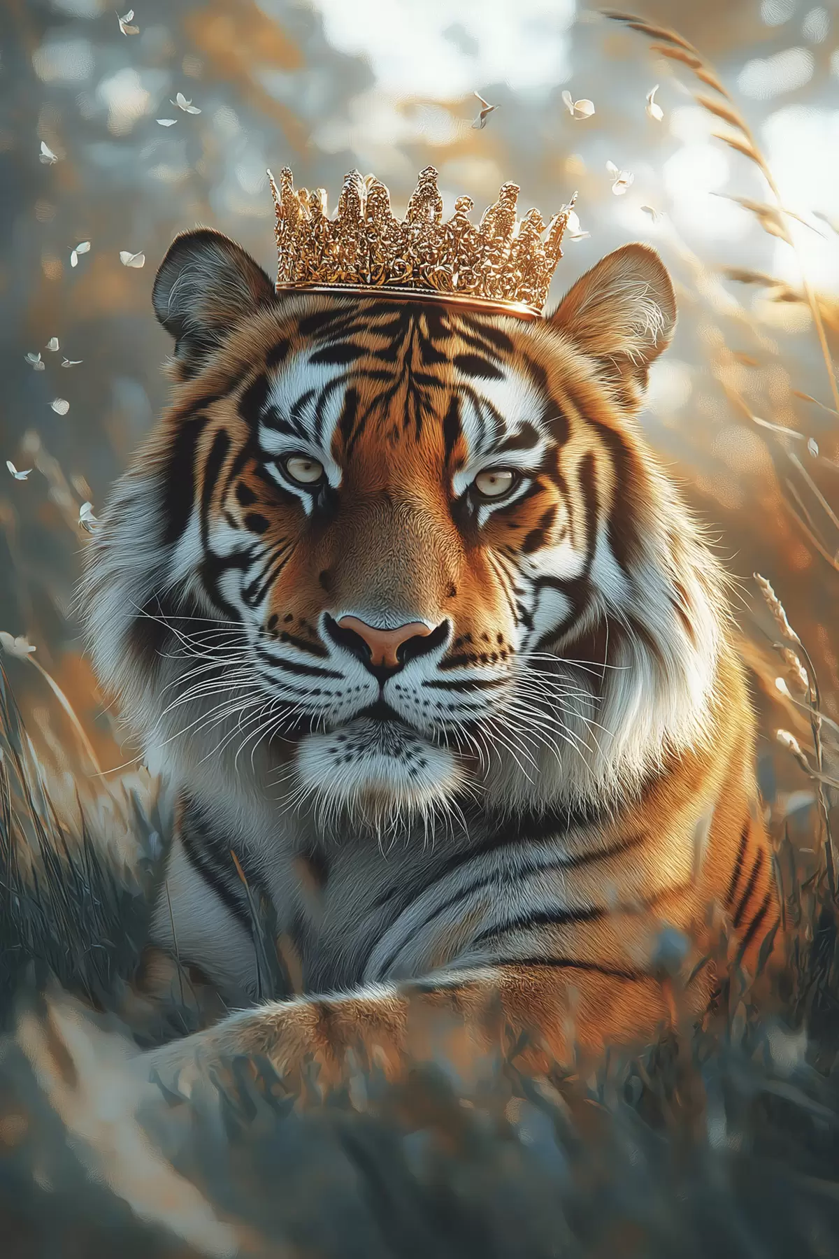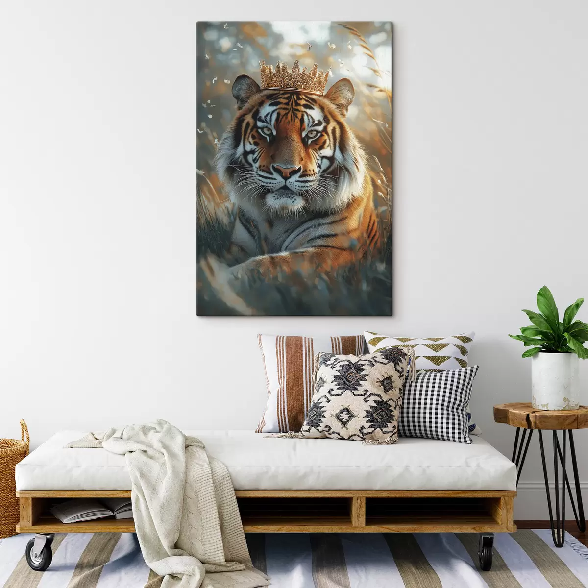 Wandbilder Ein wunderschöner Tiger mit einer Krone, eine Sommerwiese, Realismus s42786