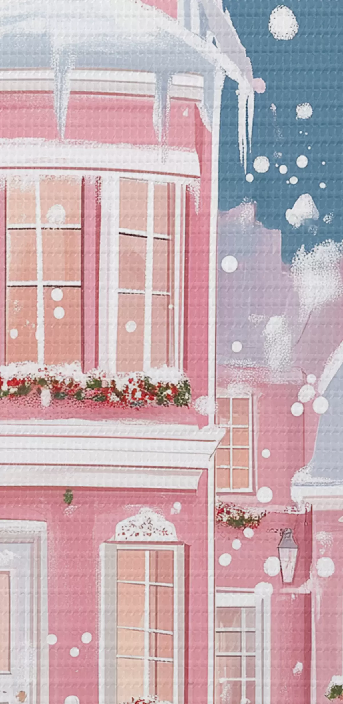 Wandbilder Winterstadt mit rosa Häusern, Weihnachtsbäumen und Schneeflocken s42792