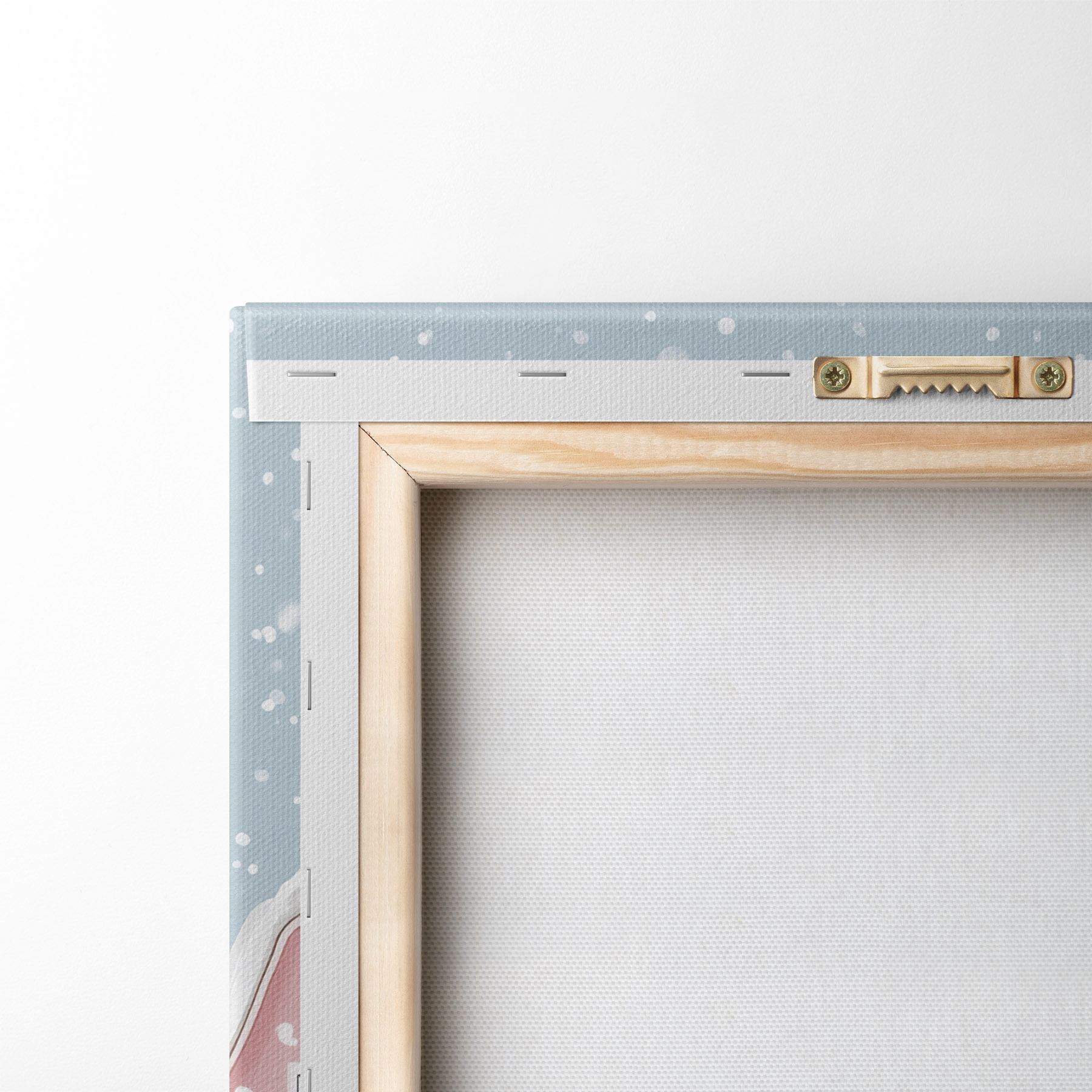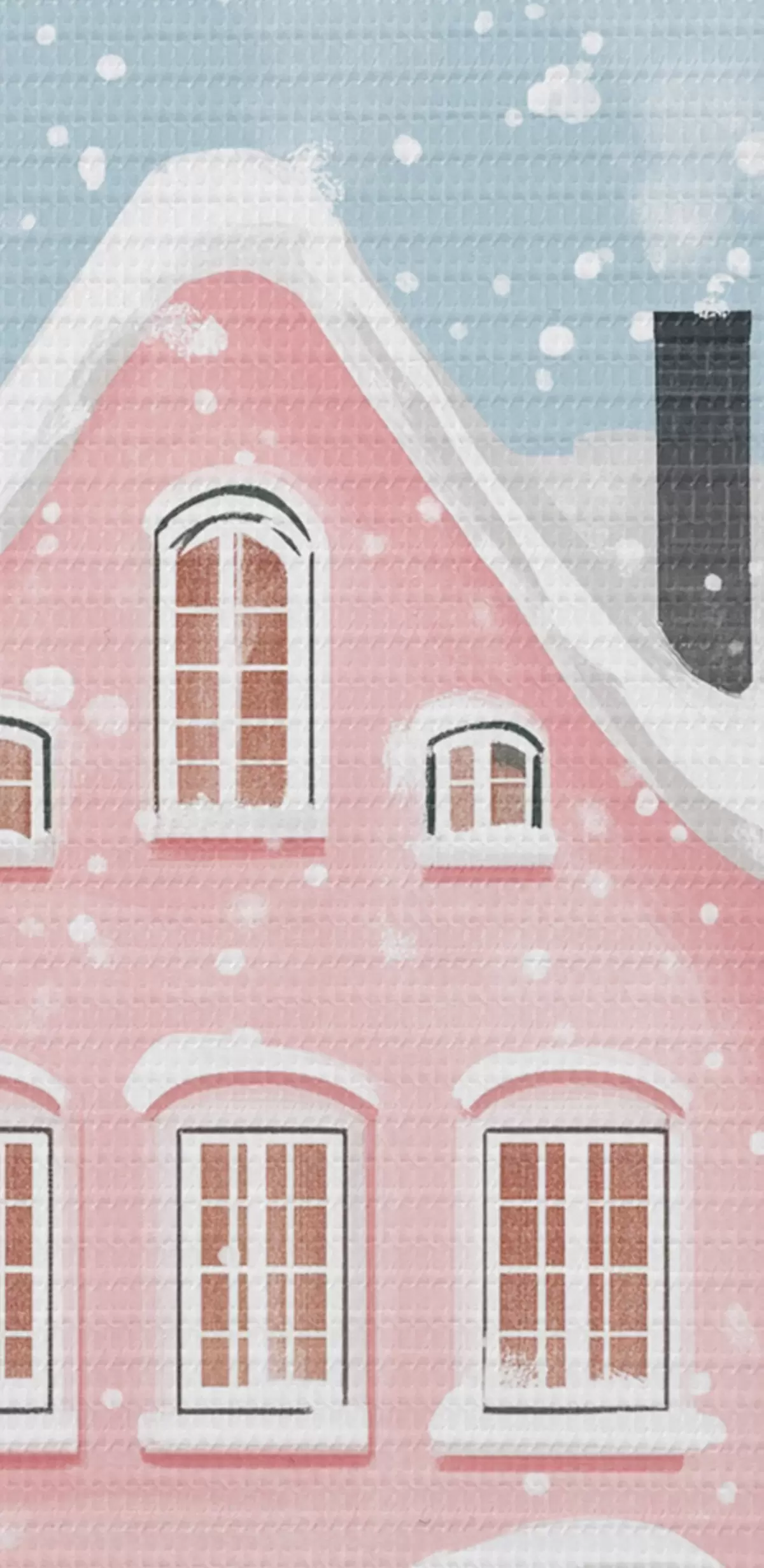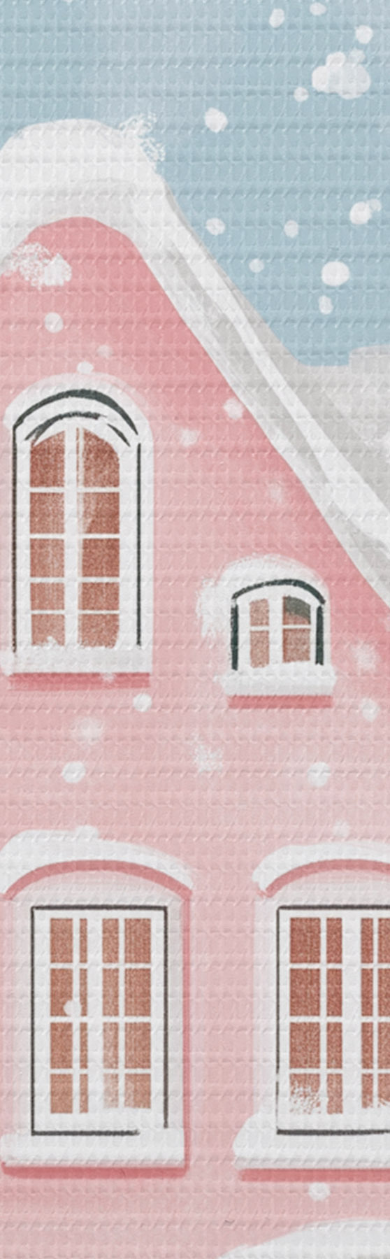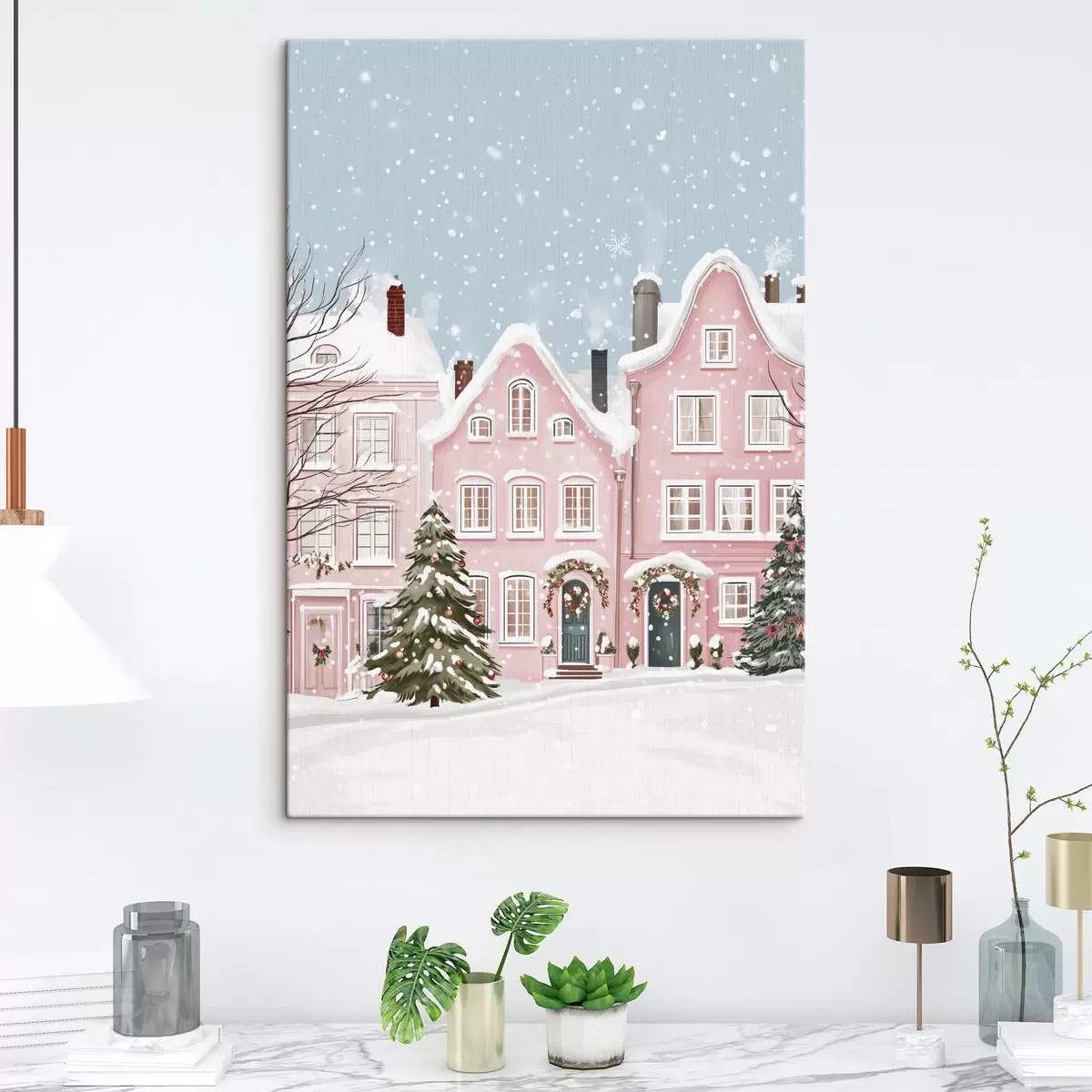 Wandbilder Schöne Stadt mit niedlichen rosa Häusern, Winterästhetik, Schneeflocken Art. s42793