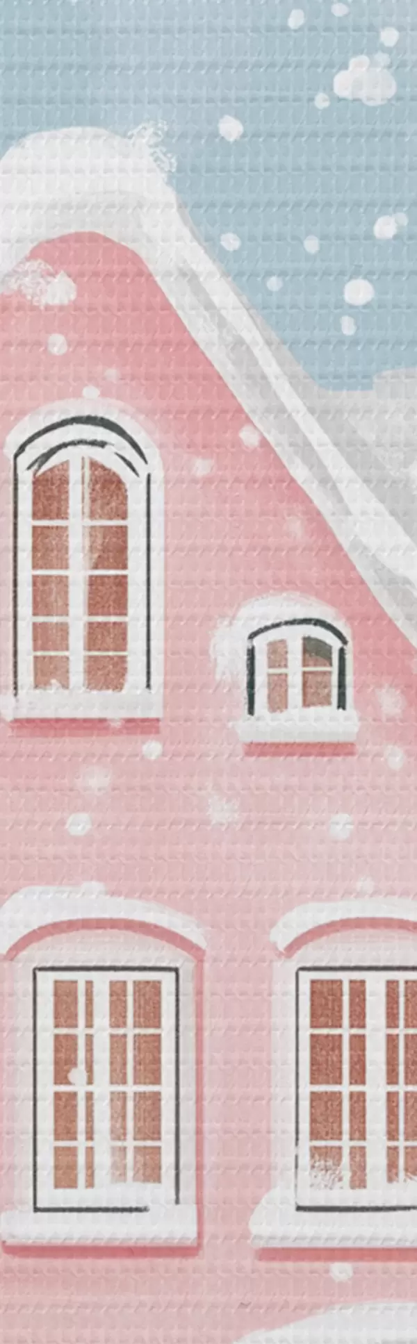 Wandbilder Schöne Stadt mit niedlichen rosa Häusern, Winterästhetik, Schneeflocken s42793