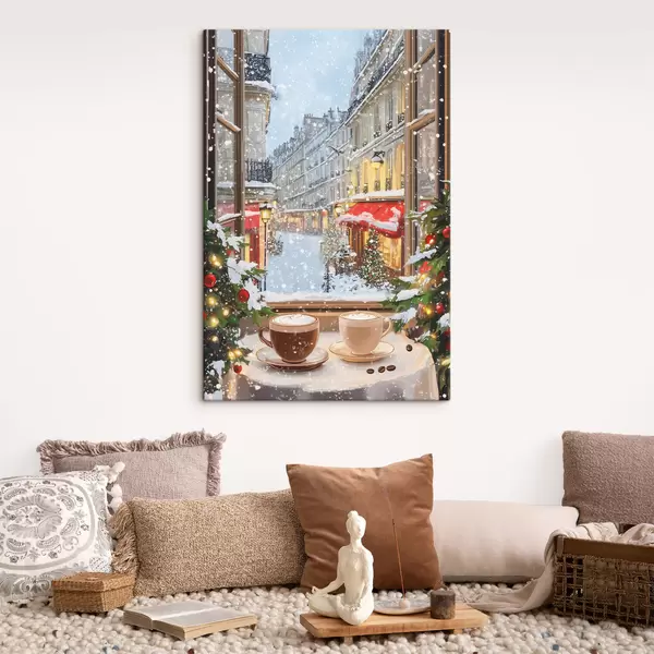 Wandbilder Gemütliches Wintercafé, Tassen Kaffee, Acryl-Stil, alte Stadtarchitektur s42795