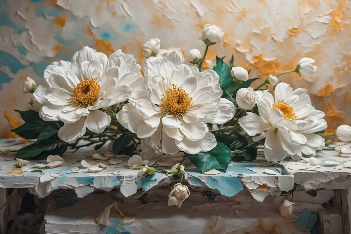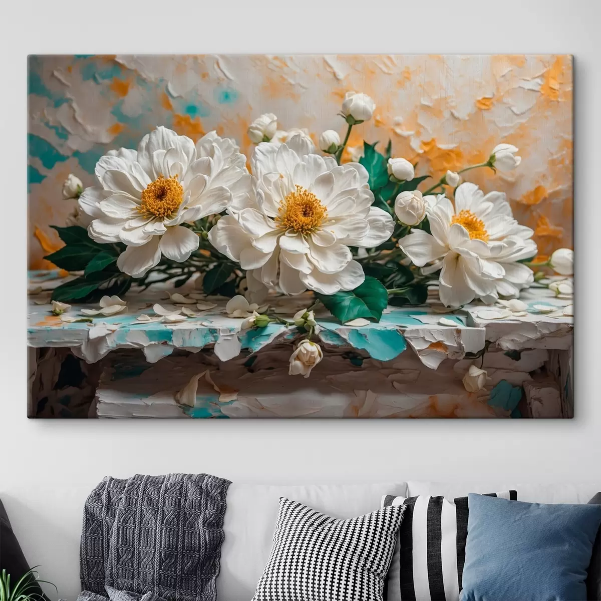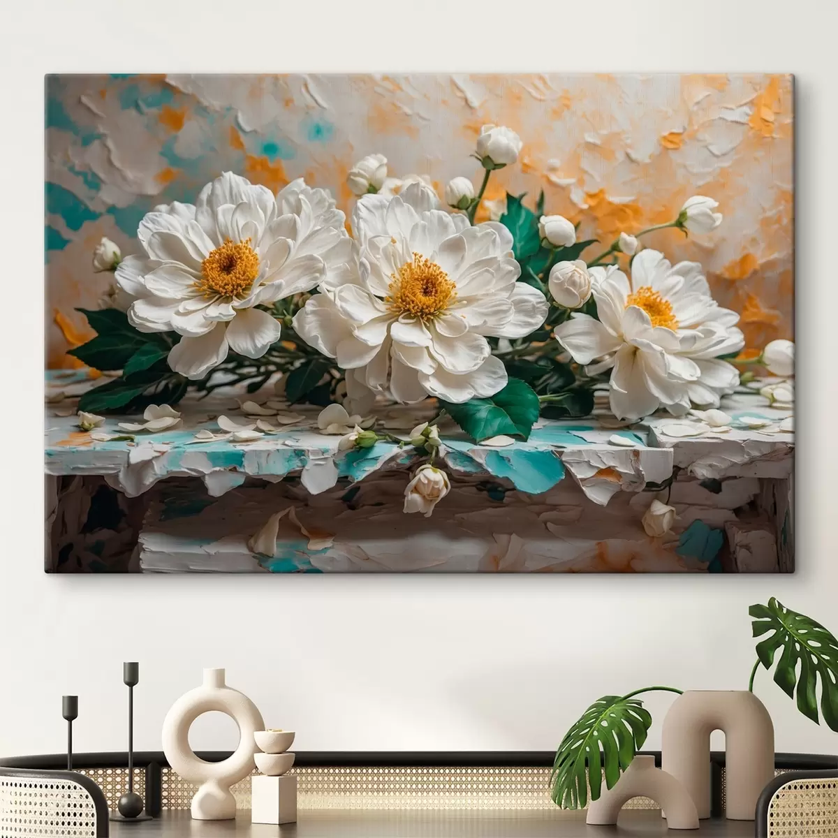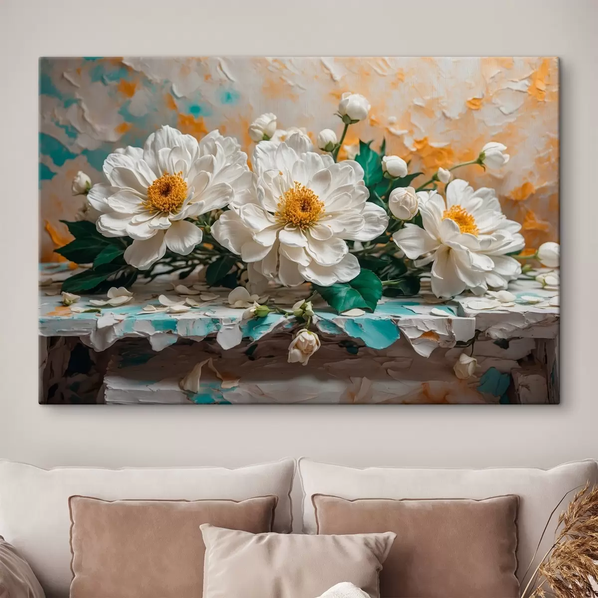 Wandbilder Weiße Blumen auf einem Tisch auf abstraktem Hintergrund Art. s42924