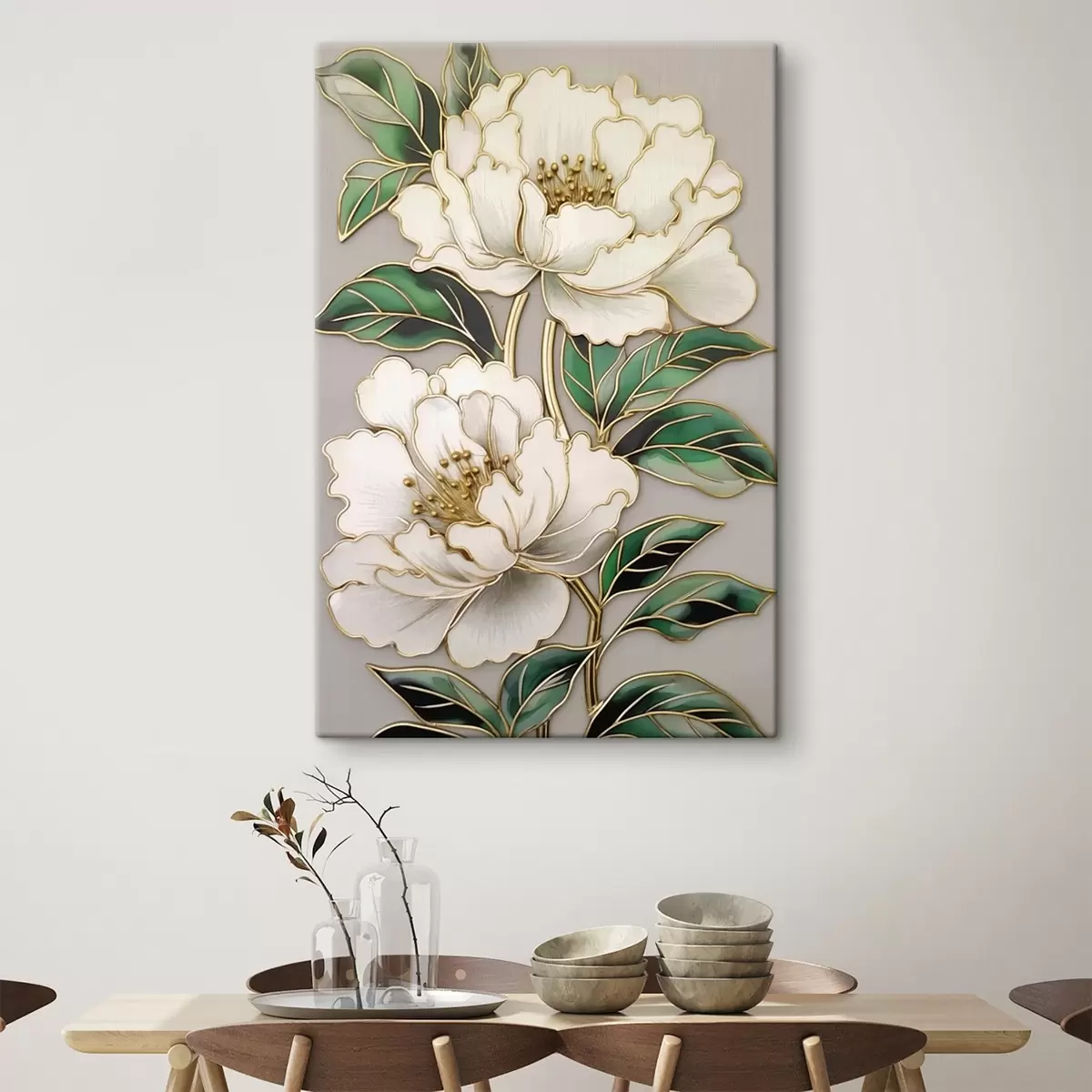 Wandbilder Weiße Blumen mit grünen Blättern in dekorativem Arrangement Art. s43011