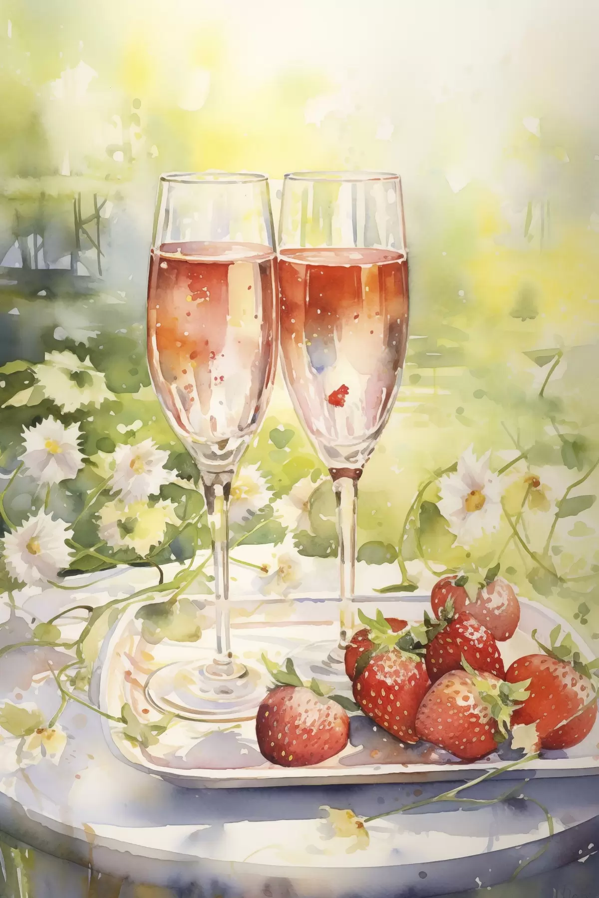 Wandbilder Aquarell-Stil Zeichnung von Champagner-Gläser, Blumen und Erdbeeren s43056
