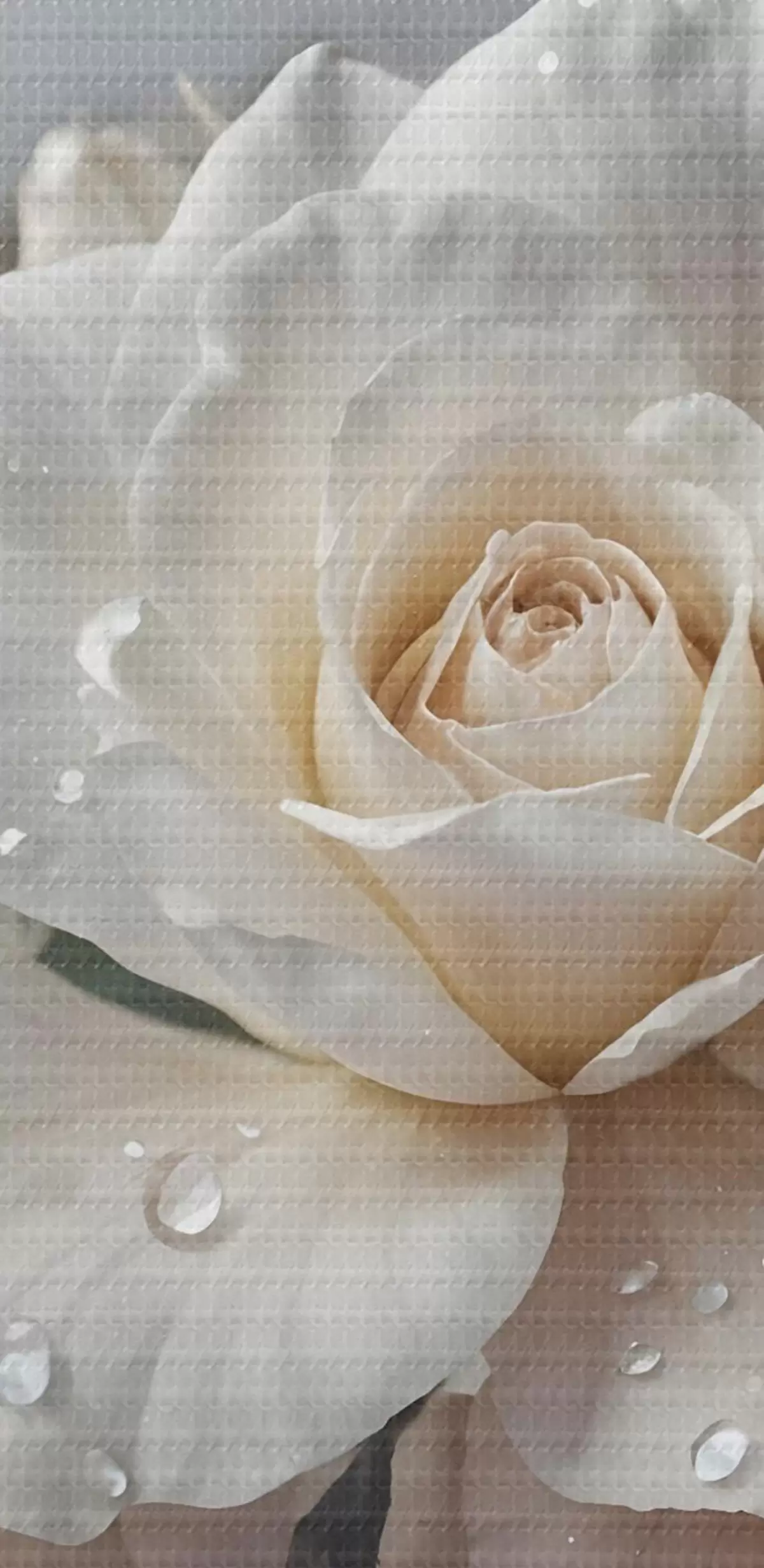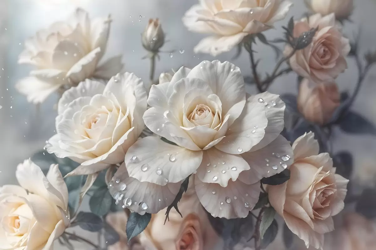 Wandbilder Eine Gruppe von weißen Rosen mit Wassertropfen auf den Blütenblättern, einige grüne Blätter, gedämpfter Hintergrund, weiches Licht s43163