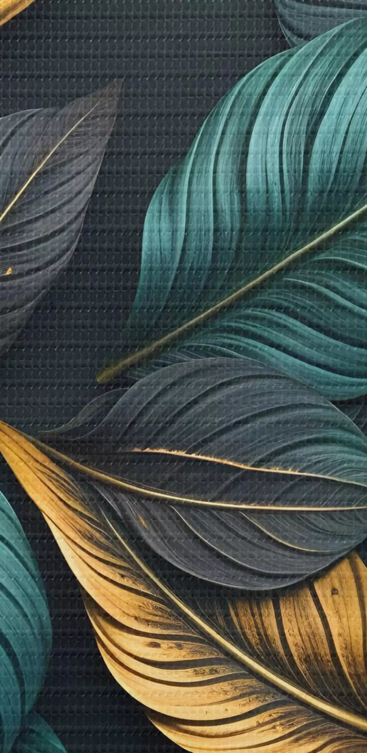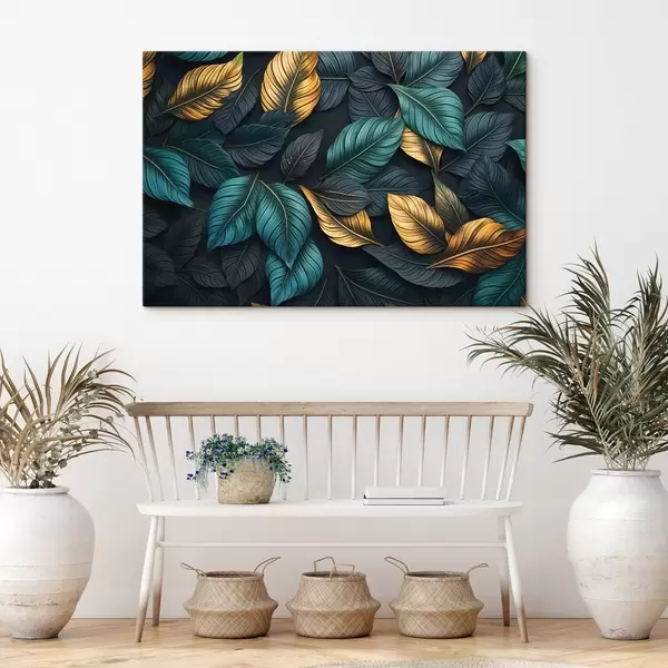 Wandbilder Dunkelgrüne, gelbe und schwarze Blätter mit dunklen Adern, auf dunklem Hintergrund, elegante tropische Stimmung Art. s43164