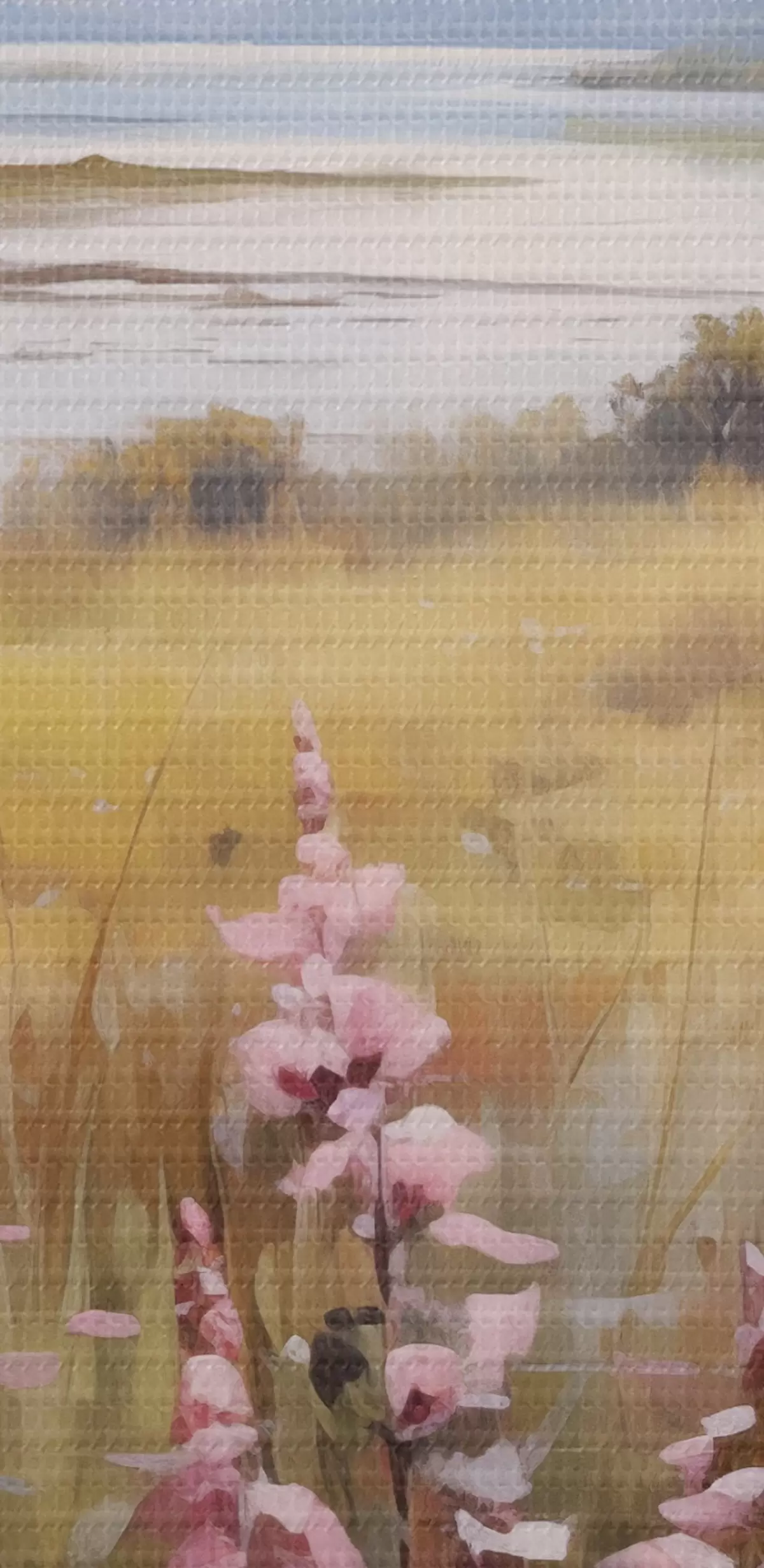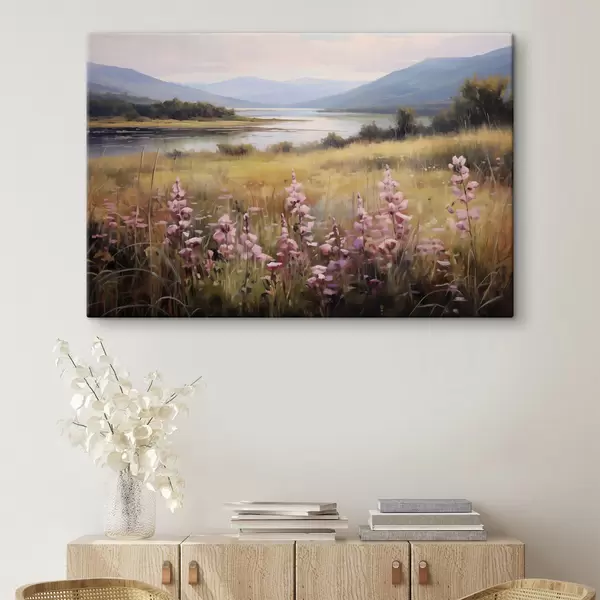 Wandbilder Eine Landschaft mit einem Feld von rosa Blumen, einem See und Bergen im Hintergrund, unter einem bewölkten Himmel Art. s43165