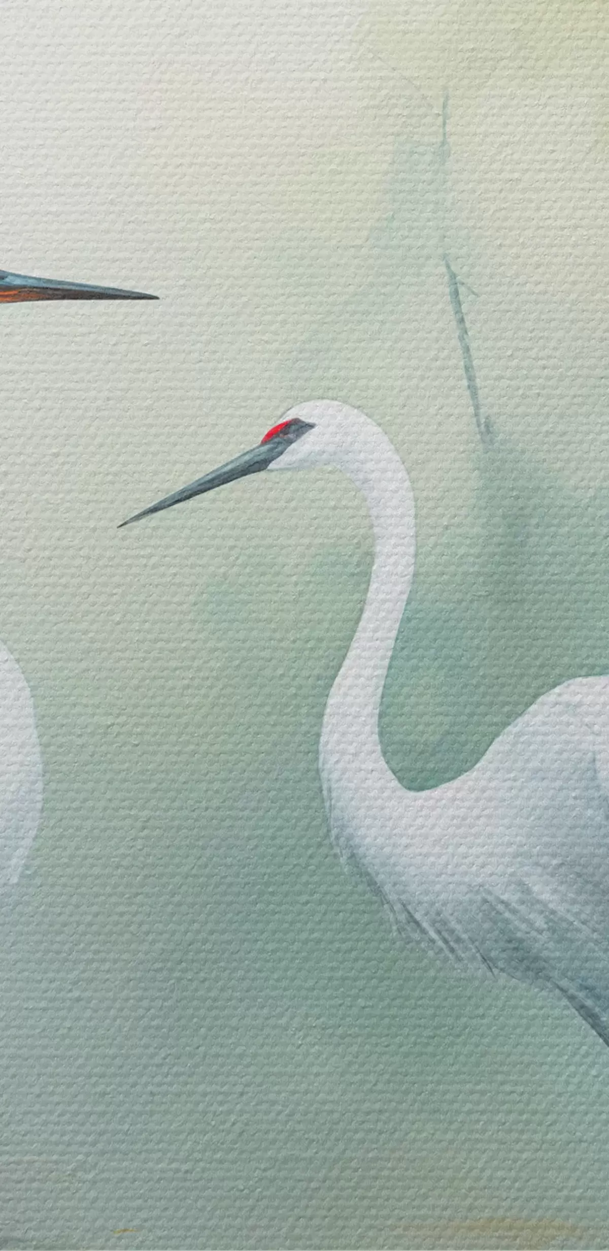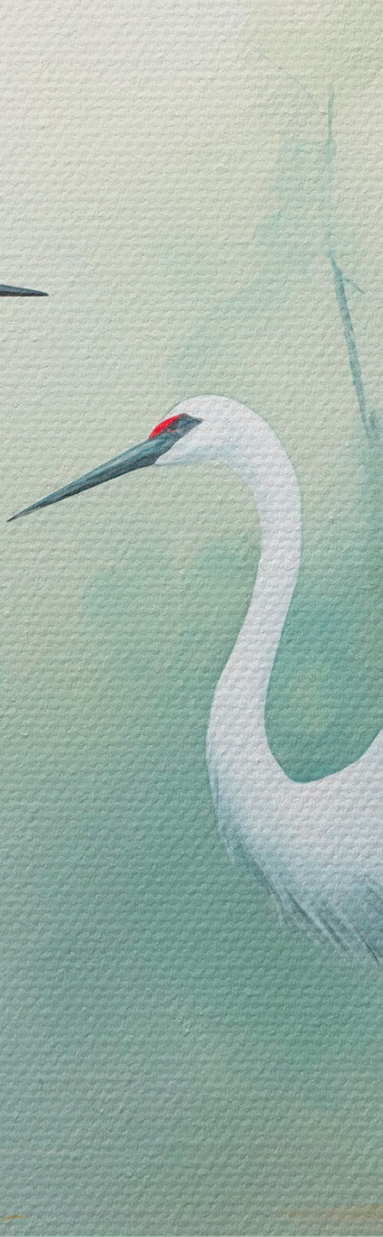 Wandbilder Zwei weiße Kraniche, die in einem Teich stehen, umgeben von einem üppigen grünen Wald mit weicher, diffuser Beleuchtung Art. s43166