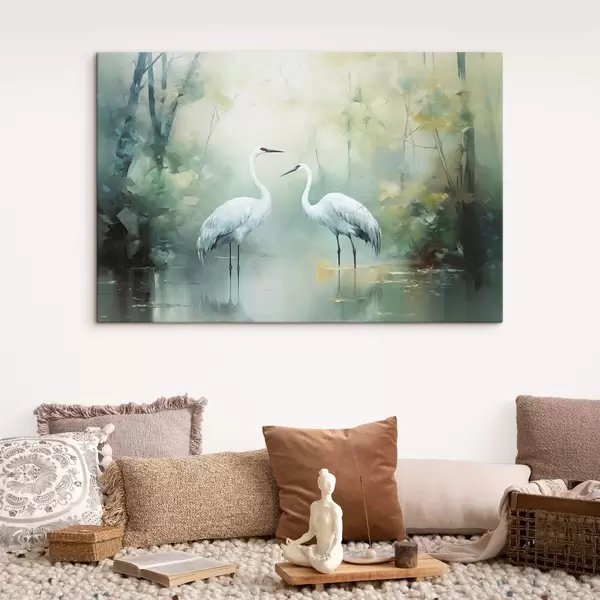 Wandbilder Zwei weiße Kraniche, die in einem Teich stehen, umgeben von einem üppigen grünen Wald mit weicher, diffuser Beleuchtung Art. s43166