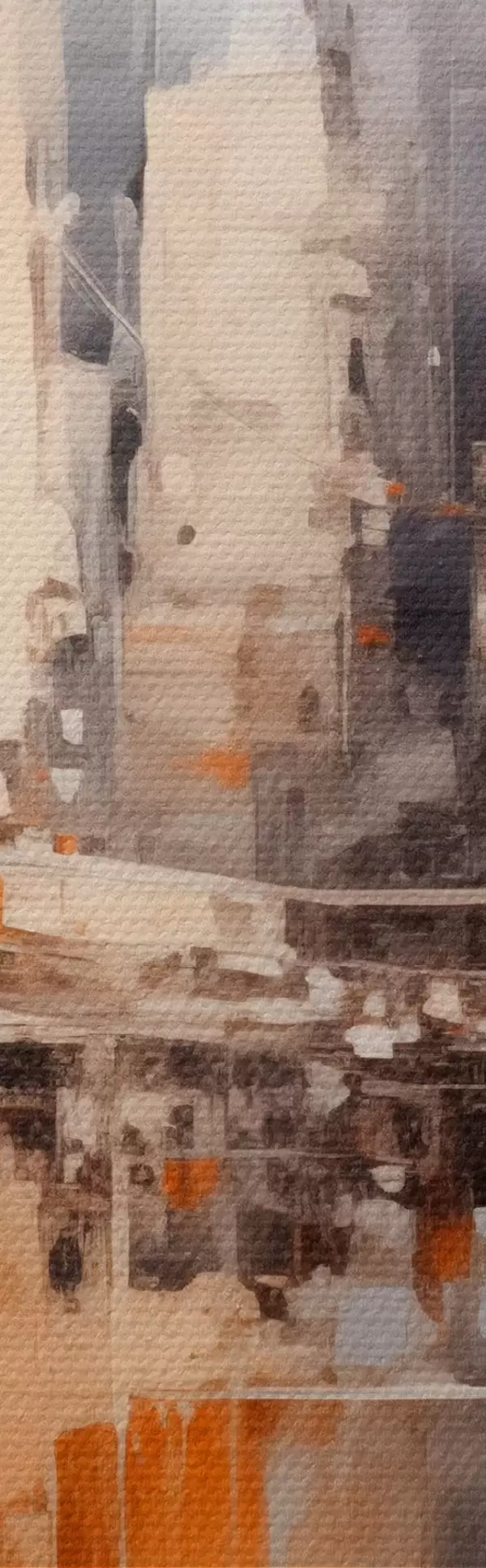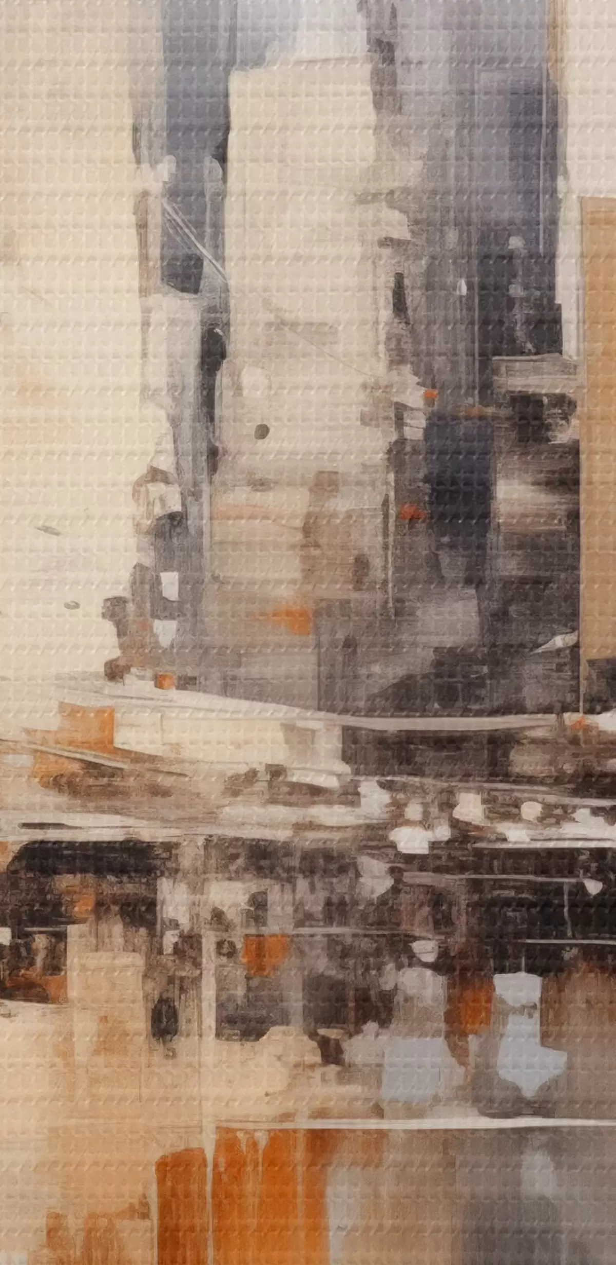 Wandbilder Abstraktes Gemälde einer Stadtlandschaft mit hohen Gebäuden in Braun-, Grau- und Weißtönen, die sich im Wasser spiegeln Art. s43168