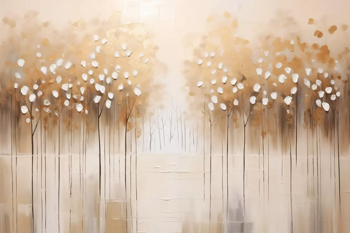 Wandbilder Ölgemälde Nachahmung von braunen Bäumen mit weißen Blättern in einem Wald mit einem Fluss in der Mitte, weißer Hintergrund Art. s43172