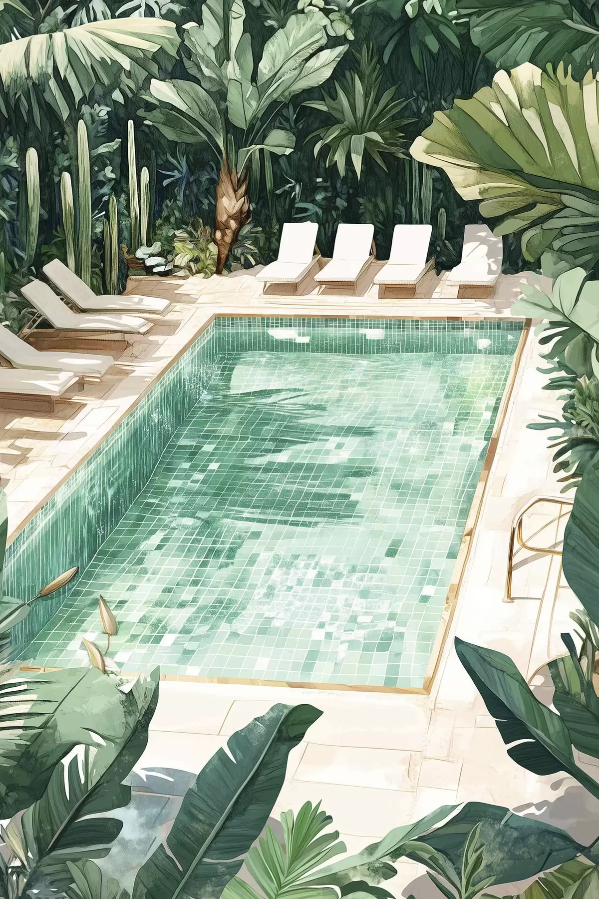 Wandbilder Sommer-Pool im grünen Garten, Vintage-Stil, Aquarell s43189