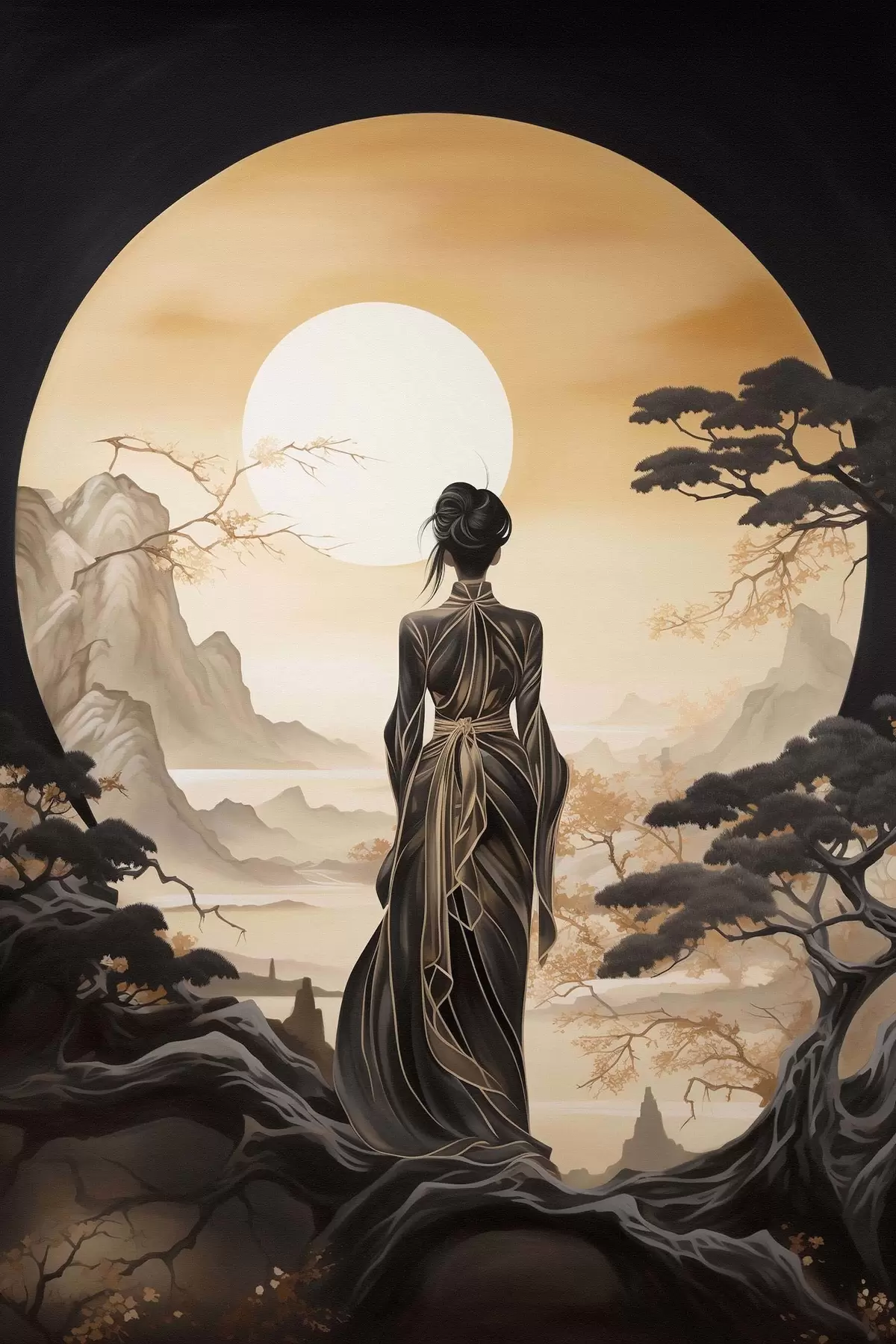 Wandbilder Menschen, Japan, Mädchen bei Sonnenuntergang vor dem Hintergrund von Sakura und Bergen Art. s43256