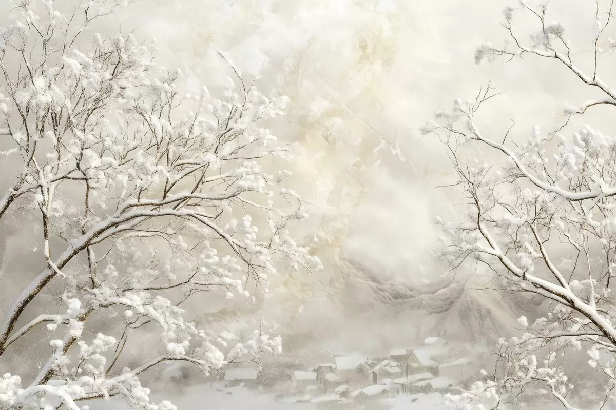 Wandbilder Winterzweige mit Schnee vor dem Hintergrund eines Winterdorfs Art. s43321