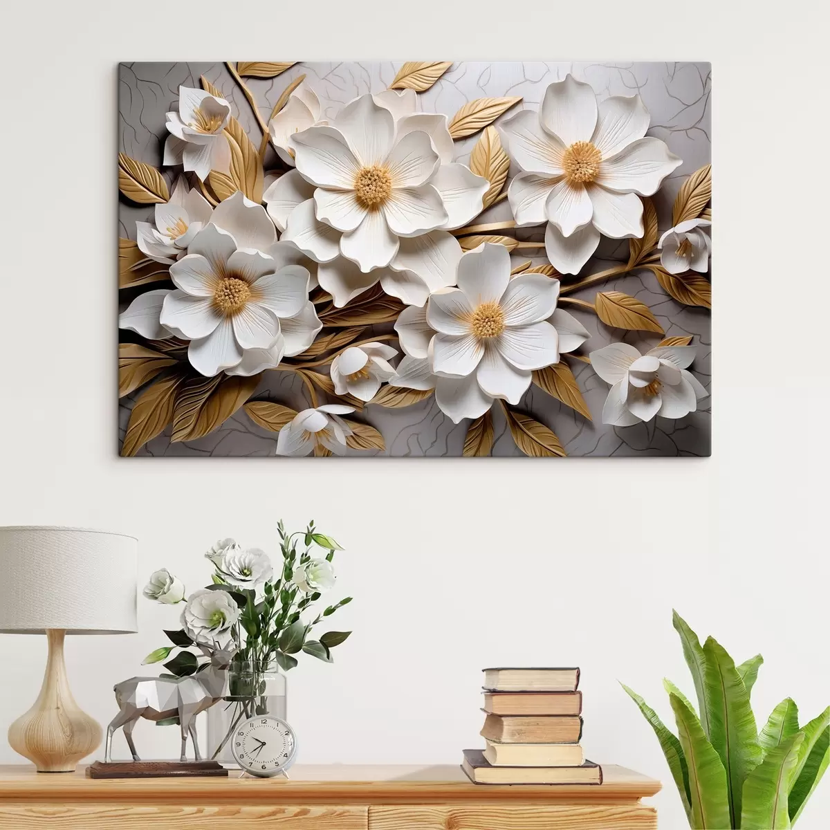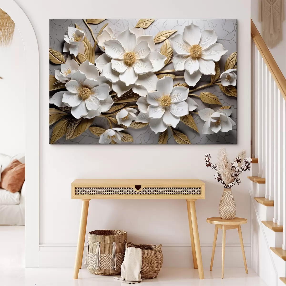 Wandbilder Weiße Blüten im Stil eines Freskenreliefs mit gelben Blättern und Staubgefäßen Art. s43330