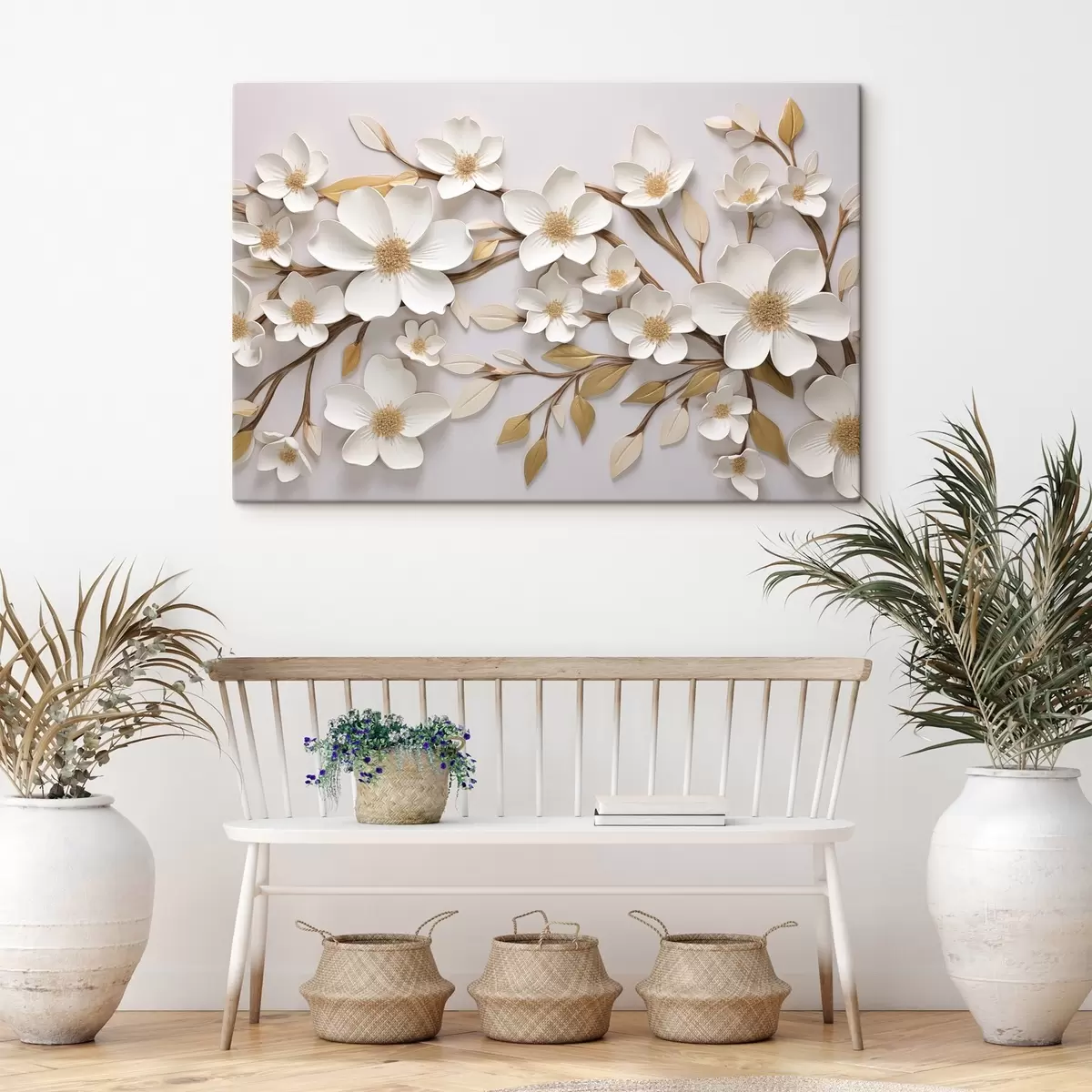 Wandbilder Weiße Blumen im Stil einer Relieffreske mit gelben Akzenten Art. s43331