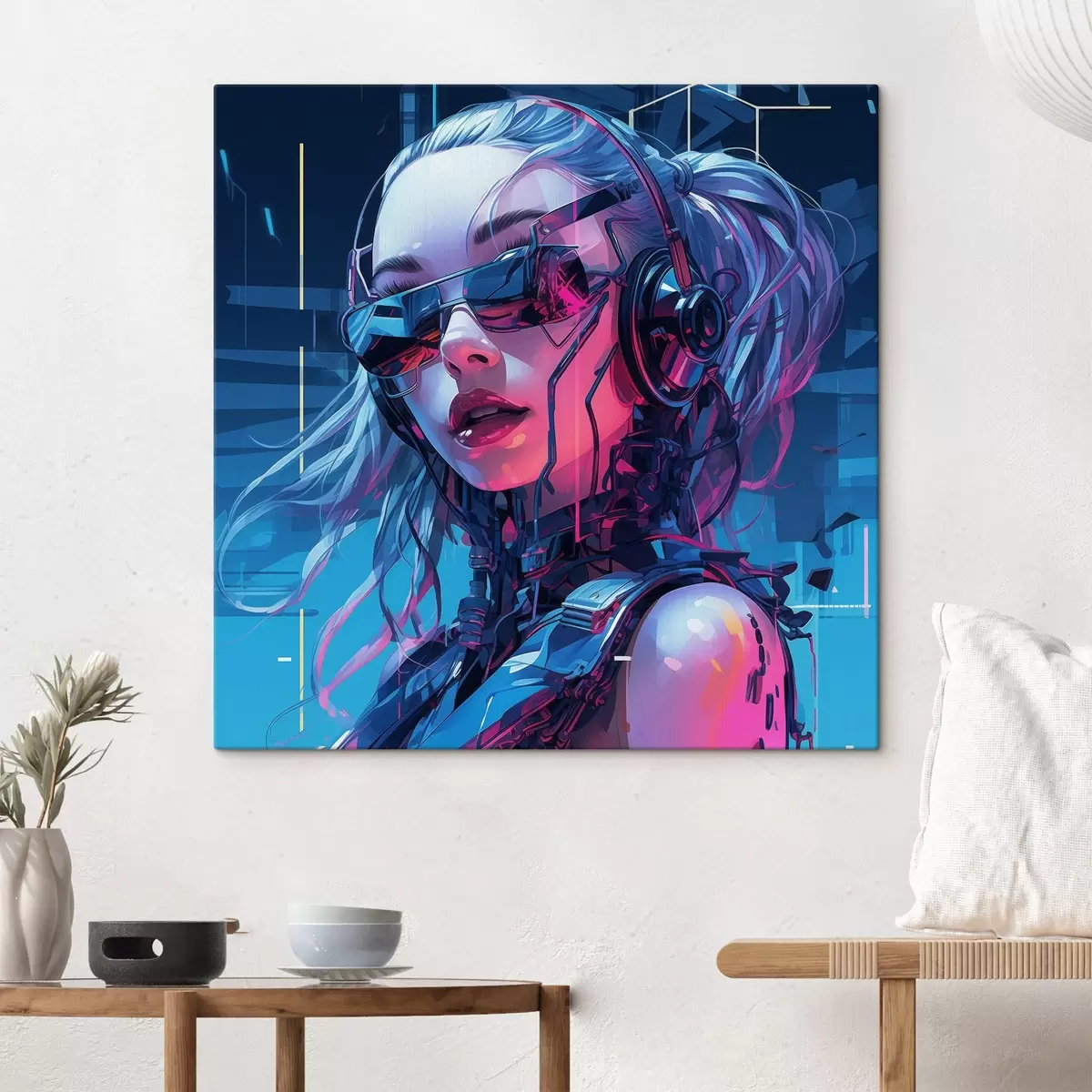 Wandbilder Futuristisches Mädchen mit Brille und Neon-Farbeffekt s43381