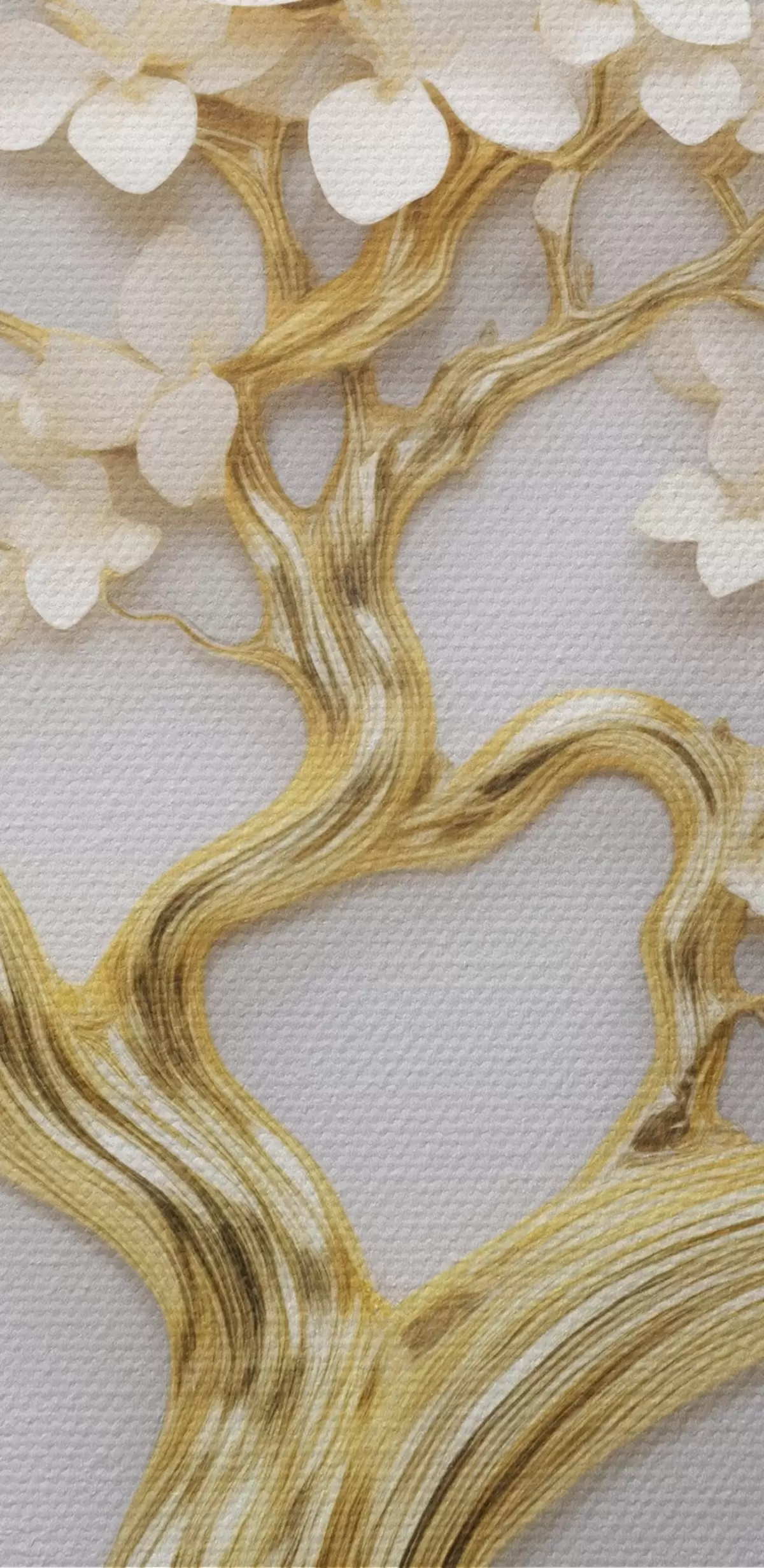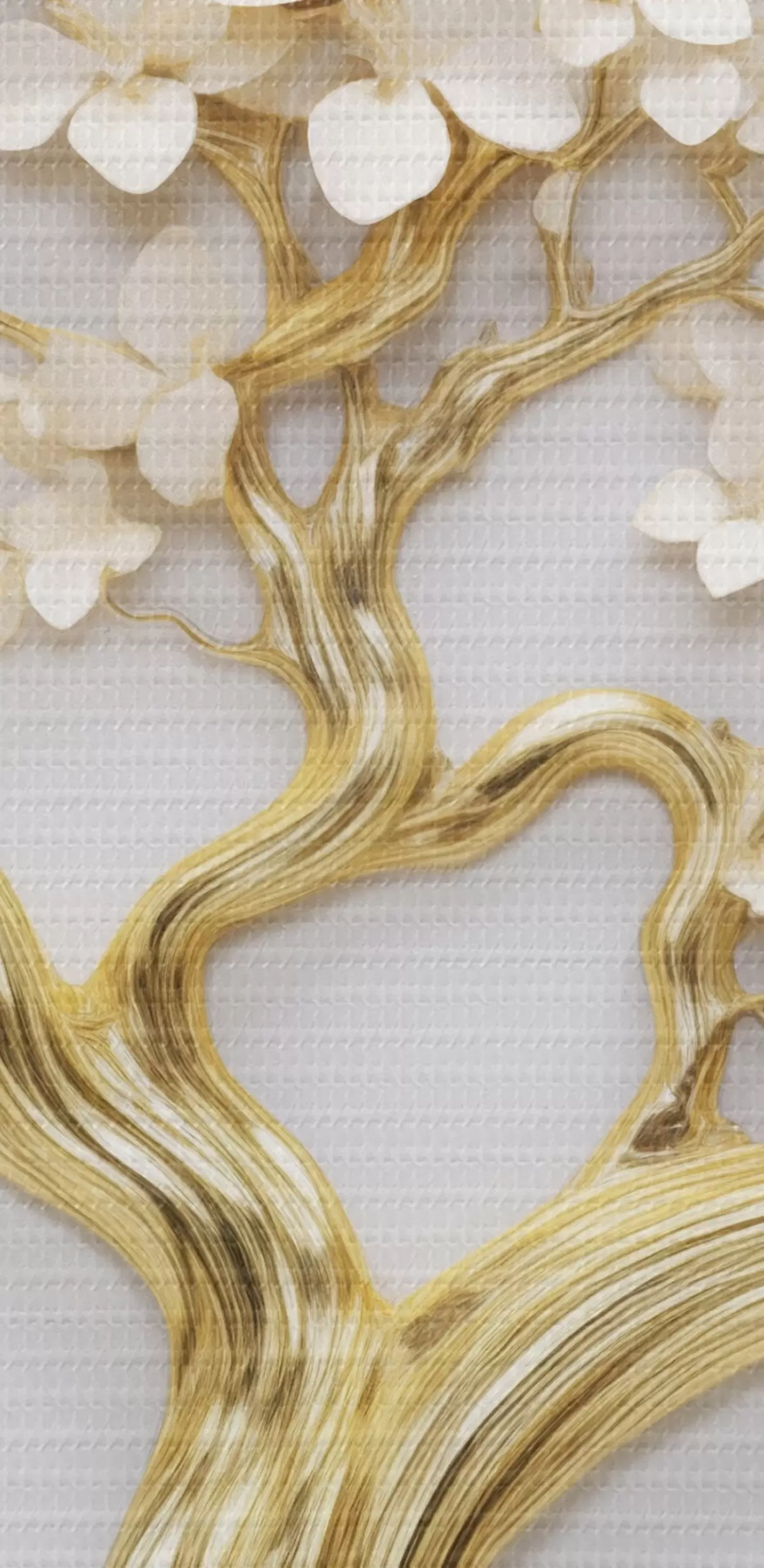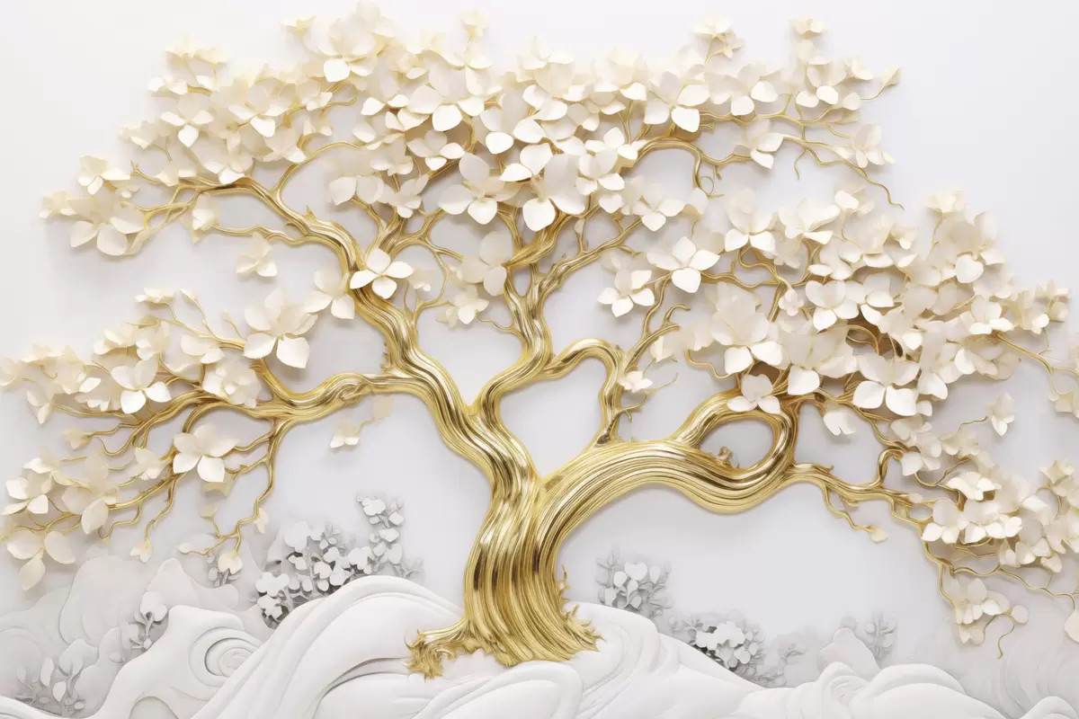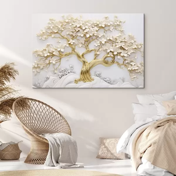 Wandbilder Dekorativer Baum mit weißen Blumen, weißer Hintergrund, weiße Felsen, komplizierte Details, von der Natur inspirierte Kunst s43388