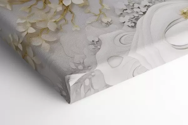 Wandbilder Dekorativer Baum mit weißen Blumen, weißer Hintergrund, weiße Felsen, komplizierte Details, von der Natur inspirierte Kunst s43388