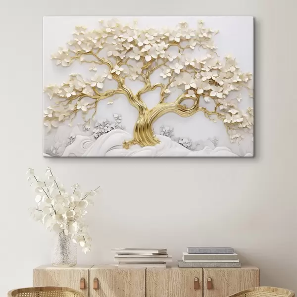 Wandbilder Dekorativer Baum mit weißen Blumen, weißer Hintergrund, weiße Felsen, komplizierte Details, von der Natur inspirierte Kunst s43388