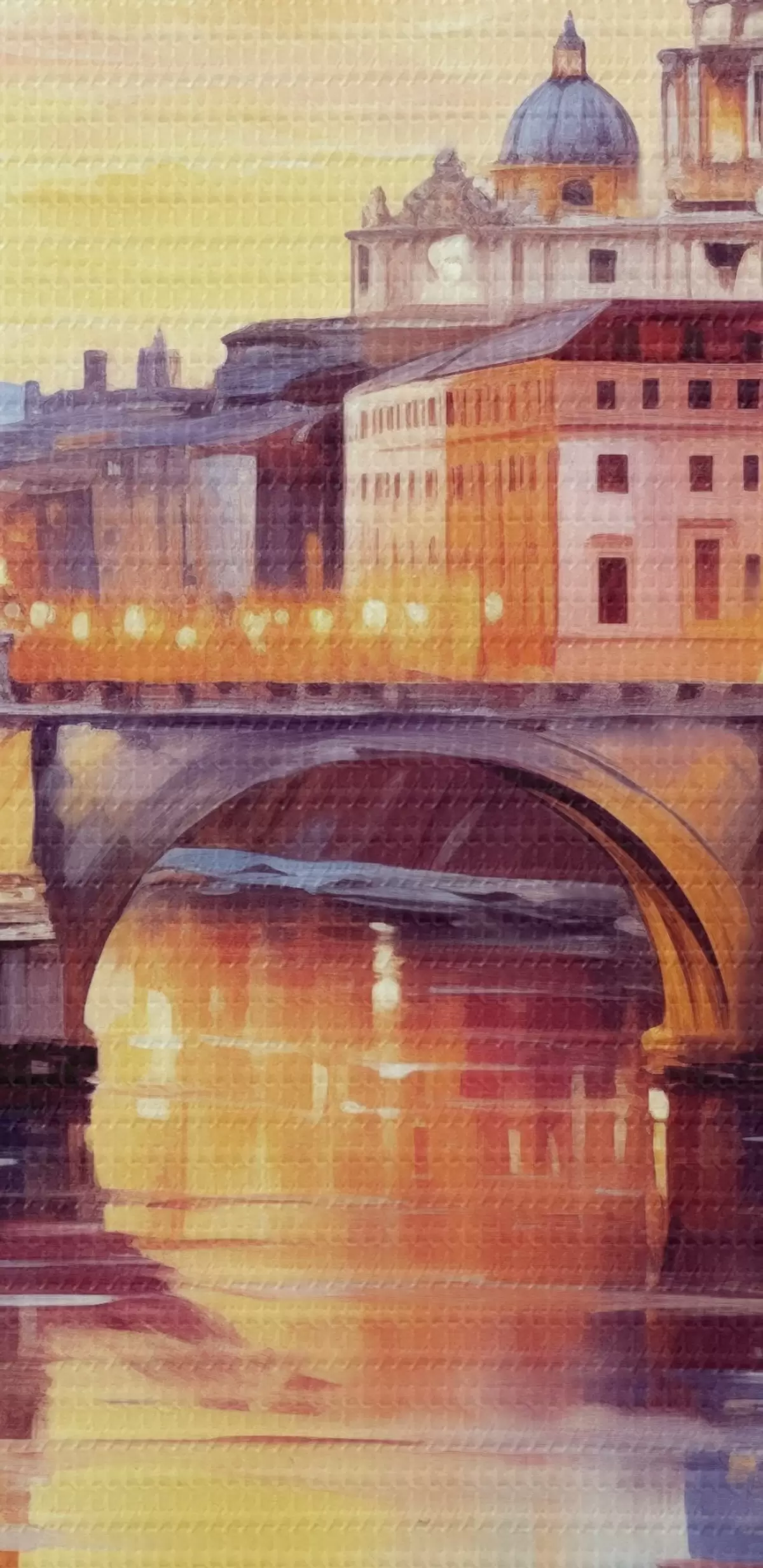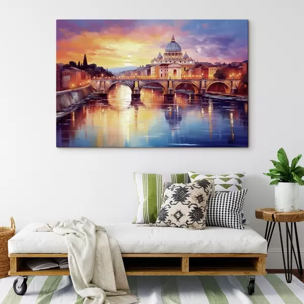 Wandbilder Petersdom und Brücke über den Fluss bei Sonnenuntergang, warme Farben, Reflexion im Wasser, Ölgemälde Stil Art. s43396