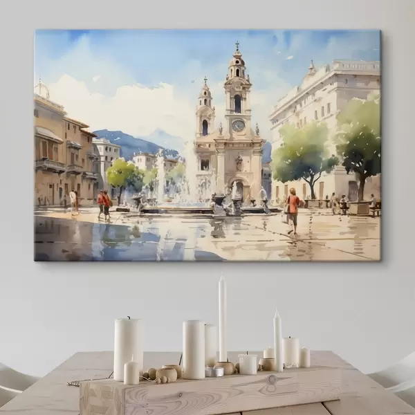 Wandbilder Abstrakte Stadtlandschaft mit Turm und Springbrunnen auf einem Stadtplatz, Berge in der Ferne, Aquarellstil Art. s43397
