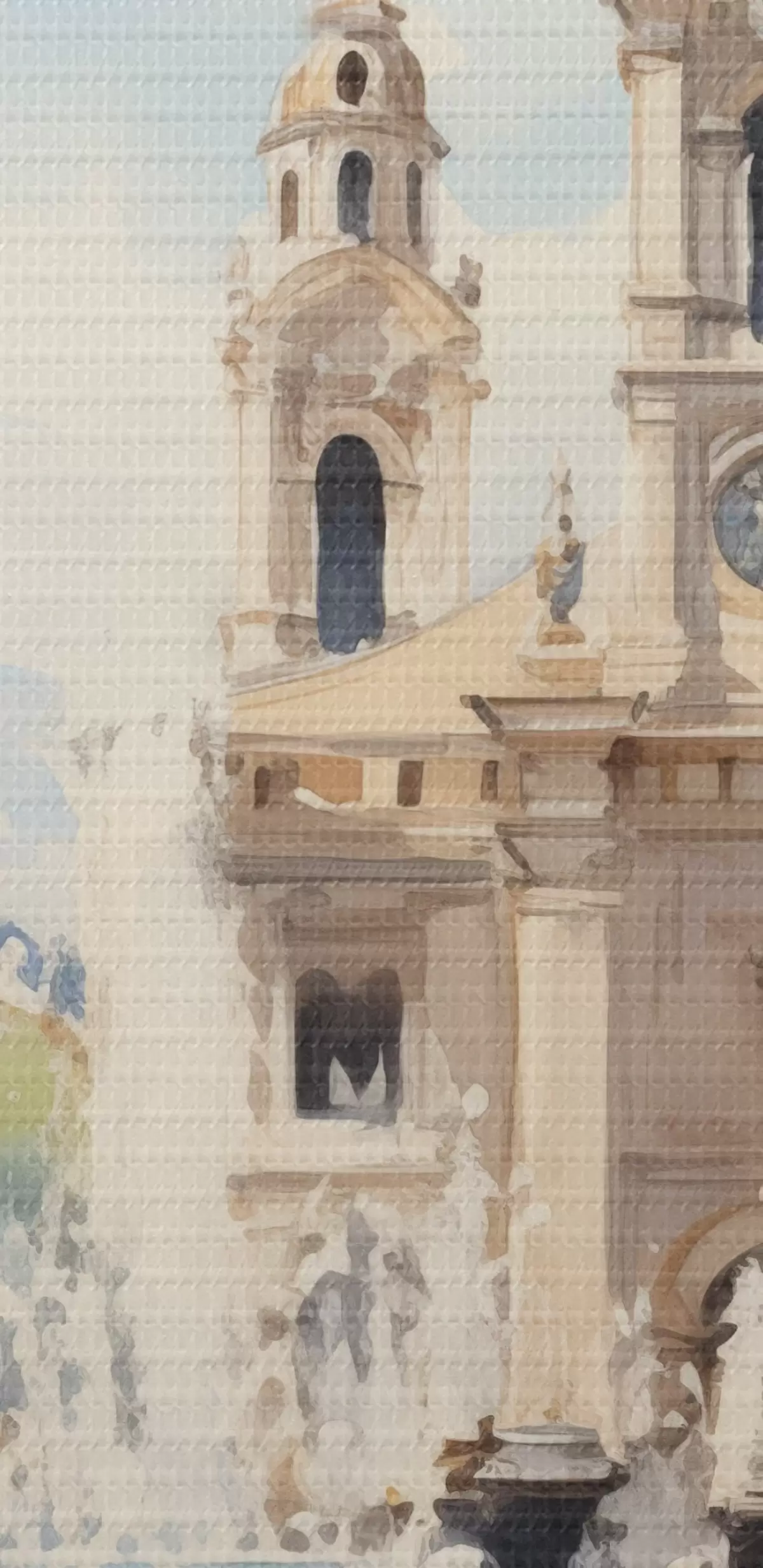 Wandbilder Abstrakte Stadtlandschaft mit Turm und Springbrunnen auf einem Stadtplatz, Berge in der Ferne, Aquarellstil s43397