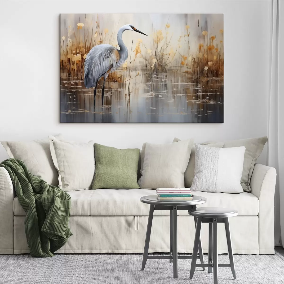 Wandbilder Ein Graureiher steht in einem Teich, umgeben von hohen, dünnen Pflanzen, der Hintergrund ist eine weiche Mischung aus Beige und Weiß Art. s43398