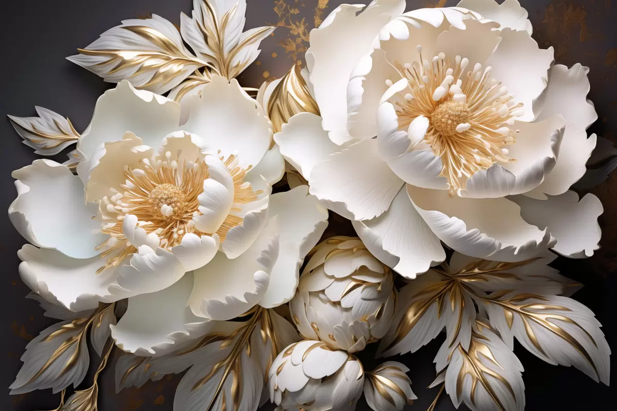Wandbilder Weiße und gelbe Pfingstrosen mit Blättern, komplizierte Details, dekorative Kunst, dunkler Hintergrund Art. s43399