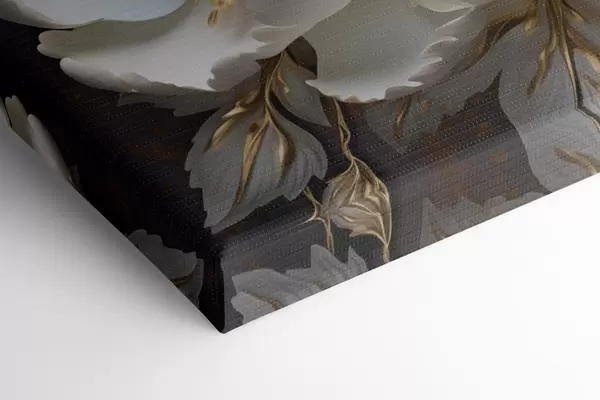 Wandbilder Weiße und gelbe Pfingstrosen mit Blättern, komplizierte Details, dekorative Kunst, dunkler Hintergrund Art. s43399