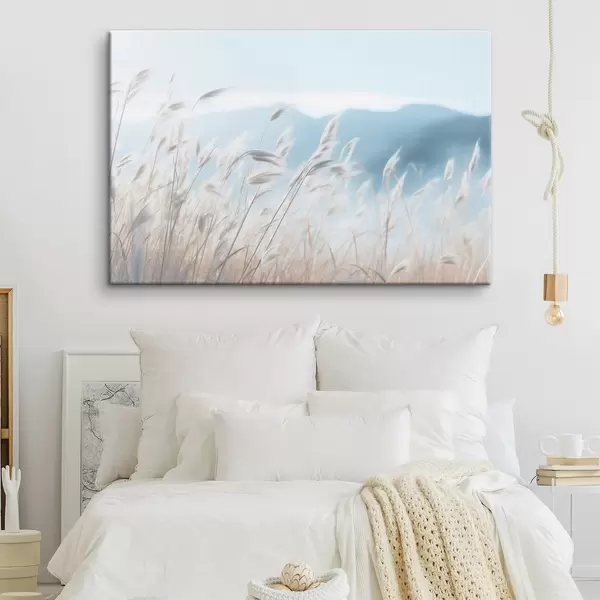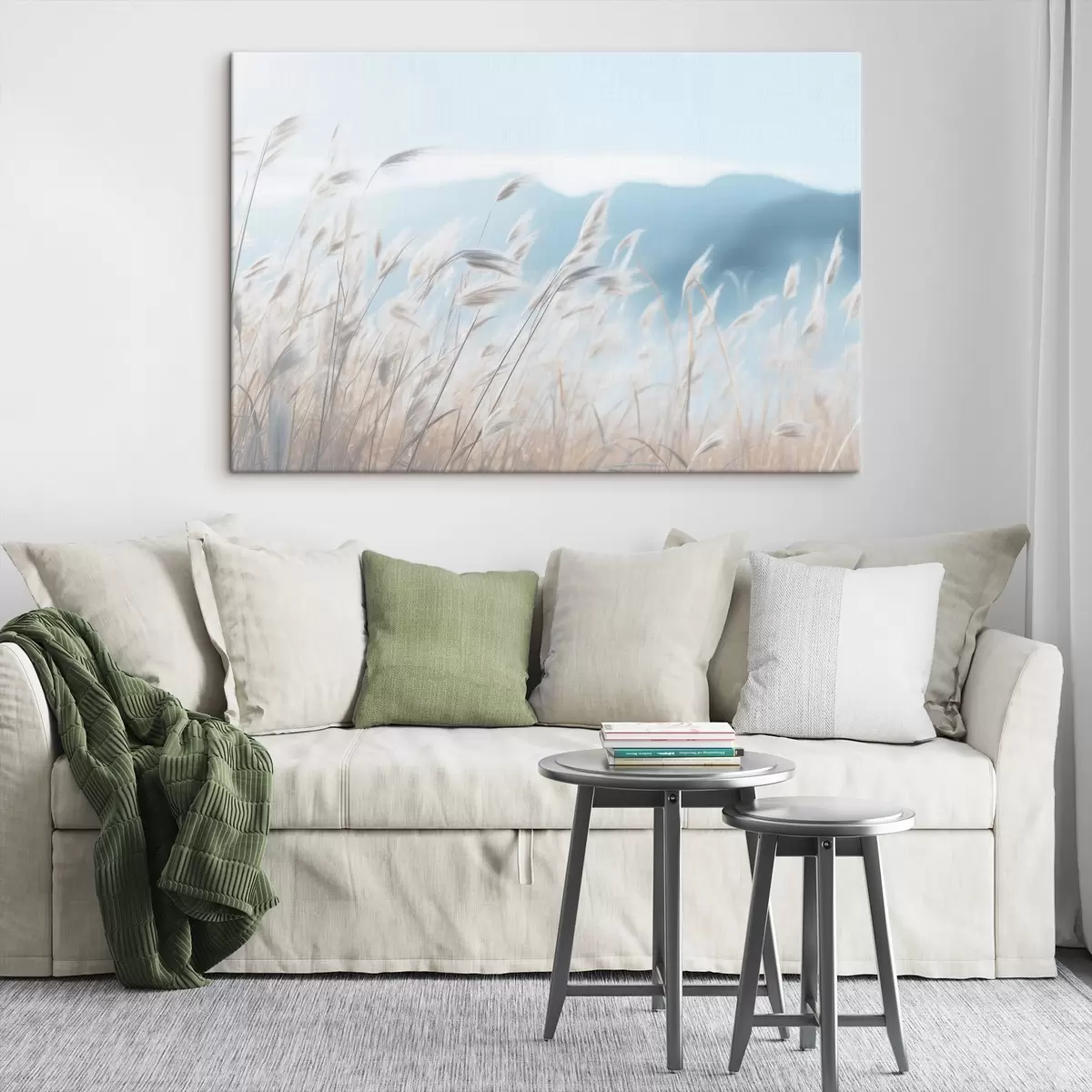 Wandbilder Gras, Pampa Feld mit einem blauen Berg im Hintergrund, hellblauer Himmel, minimalistisch, Pastellfarben Art. s43404