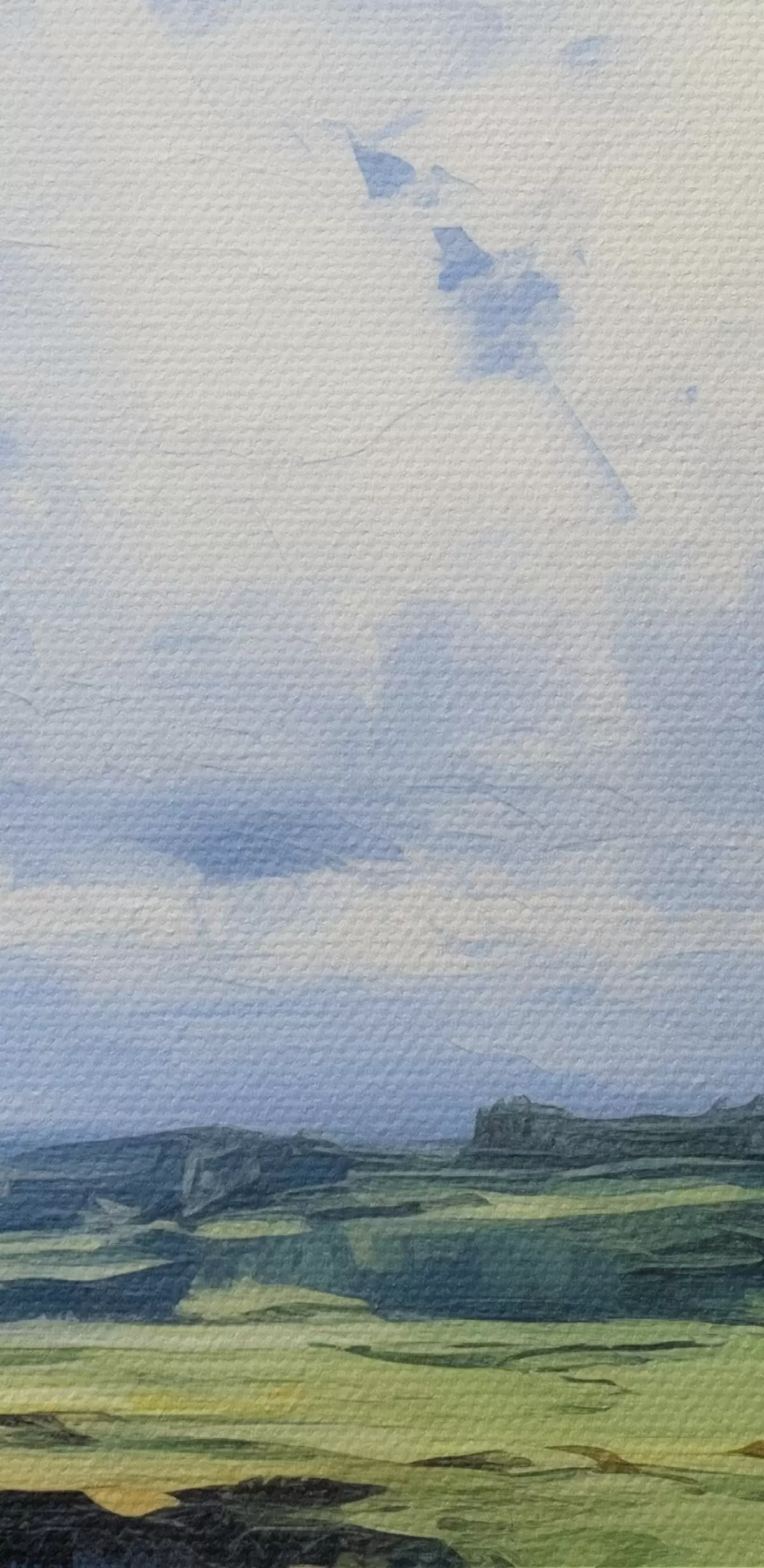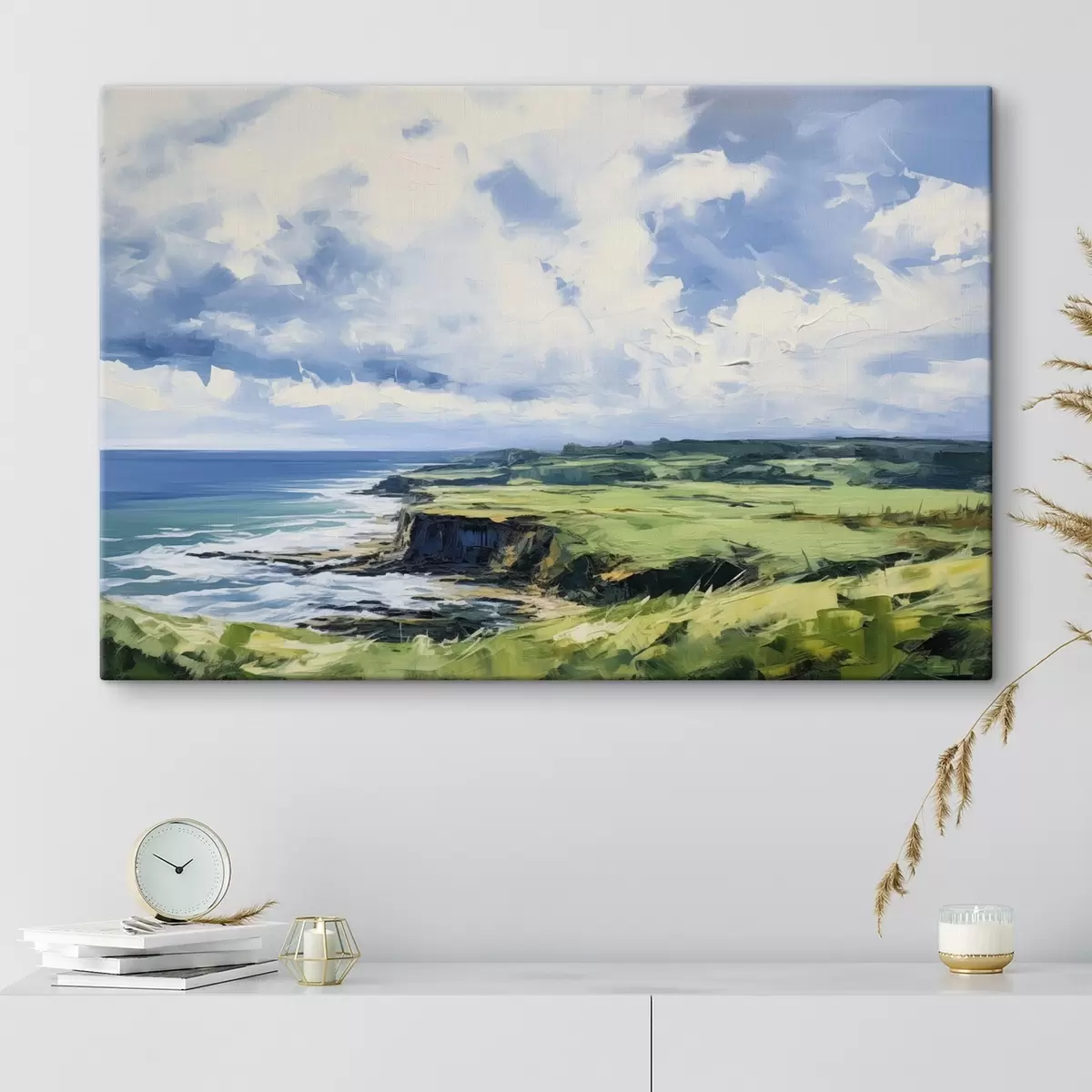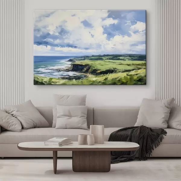 Wandbilder Grünes Feld mit einer Klippe an der Küste, blaues Meer mit Wellen, bewölkter Himmel, minimalistische moderne Ölgemälde Nachahmung s43406