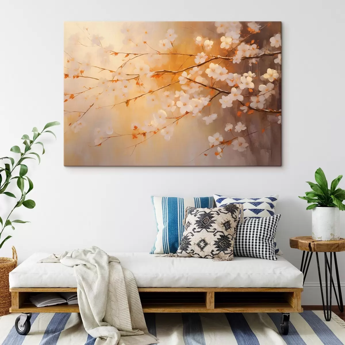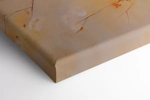 Wandbilder Kirschblütenzweige mit orangefarbenen Blüten, warme Farbpalette, vor einem unscharfen Hintergrund aus gelben Farbtönen Art. s43407
