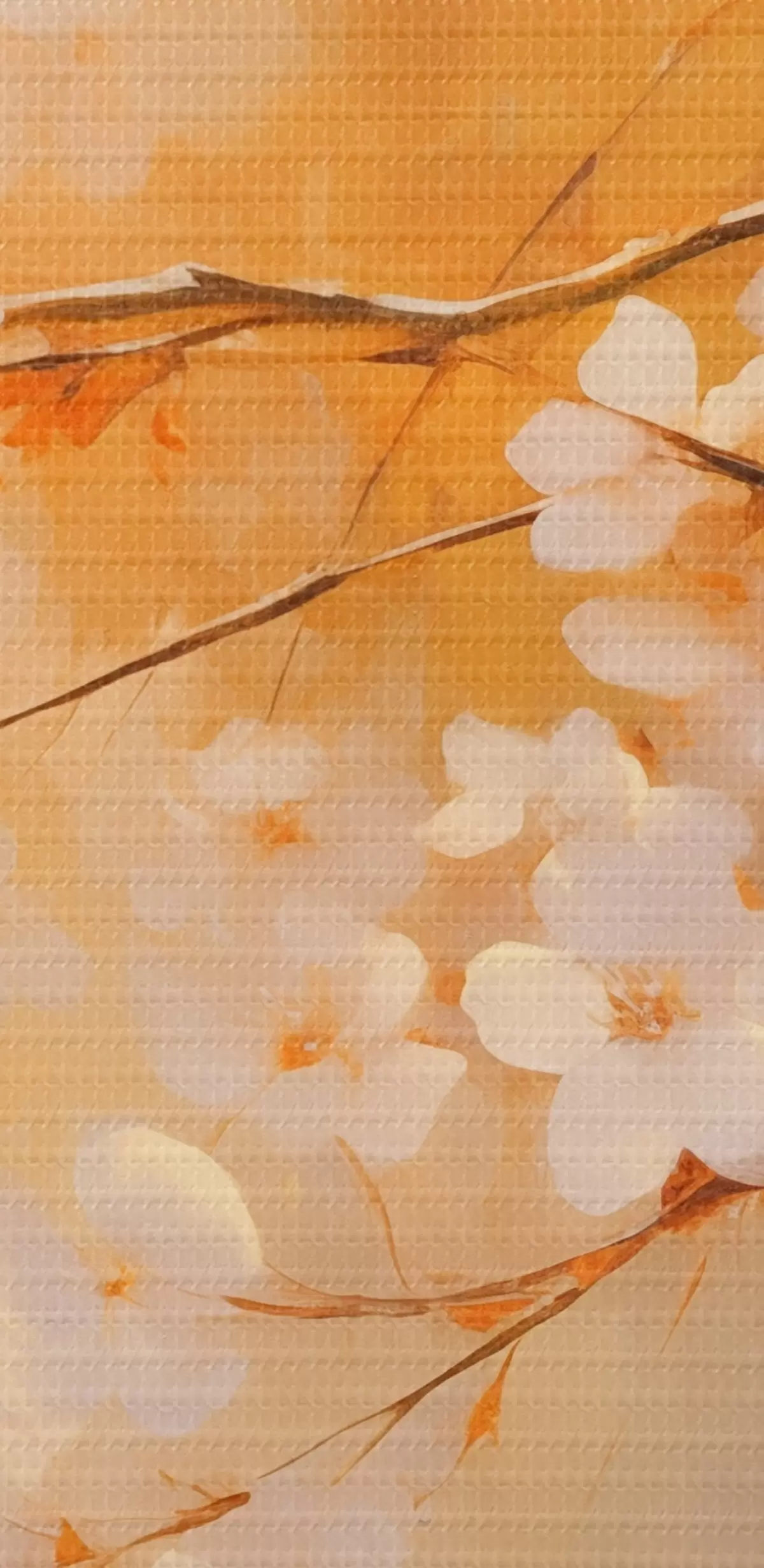 Wandbilder Kirschblütenzweige mit orangefarbenen Blüten, warme Farbpalette, vor einem unscharfen Hintergrund aus gelben Farbtönen s43407