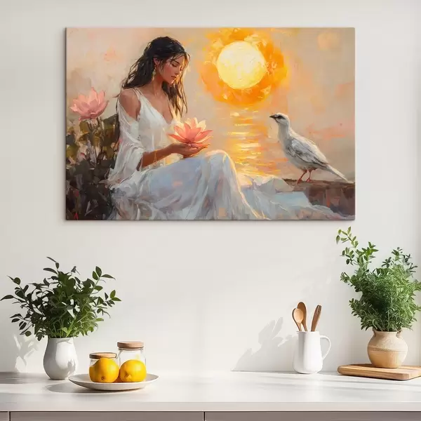 Wandbilder Frau mit Lotosblüte im Sonnenuntergang, weißer Vogel, Ölzeichnung Art. s43501