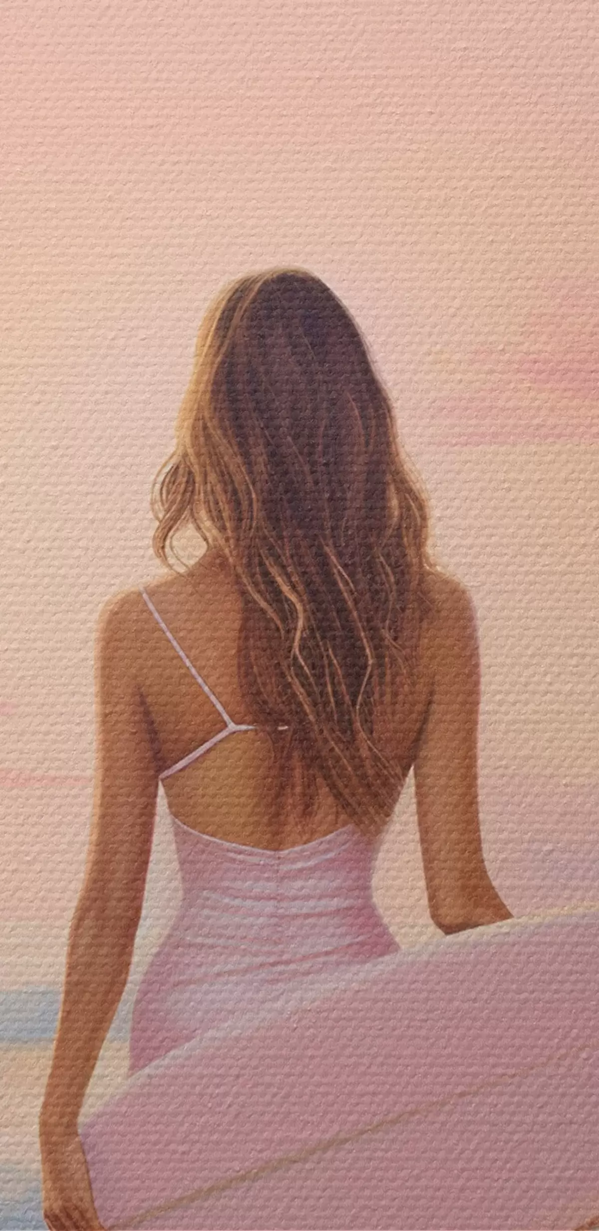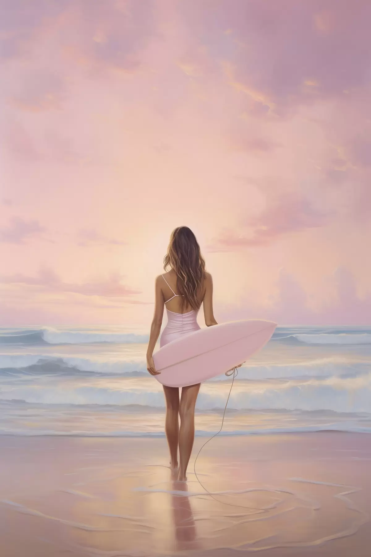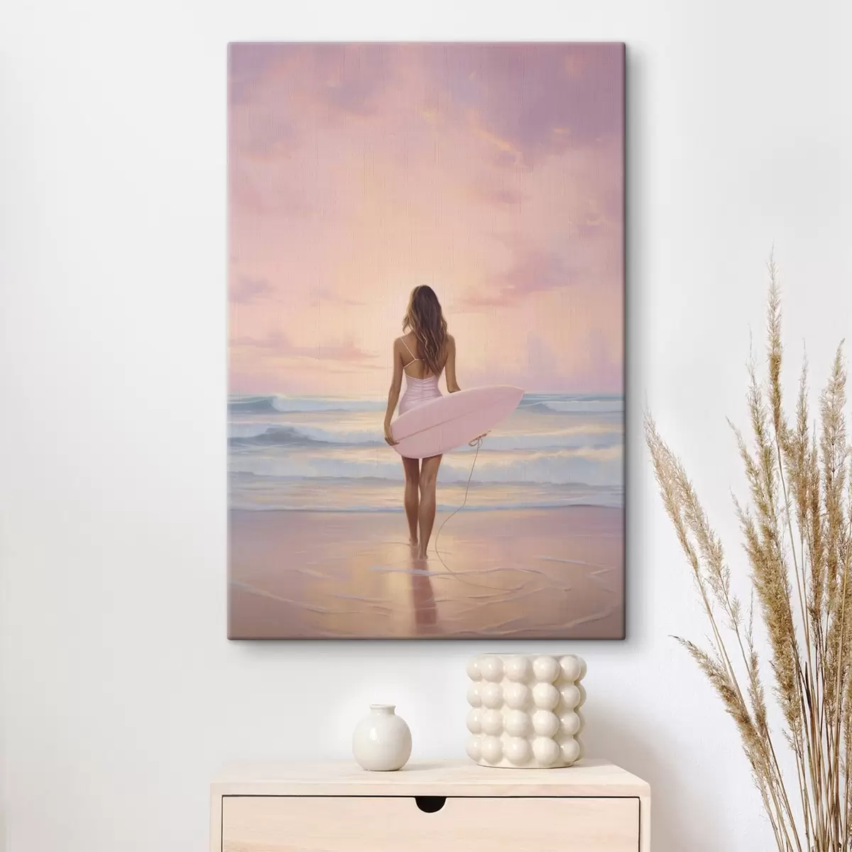 Wandbilder Mädchen mit Surfbrett auf dem Ozean Strand, Sonnenuntergang, Acryl-Stil Zeichnung Art. s43881