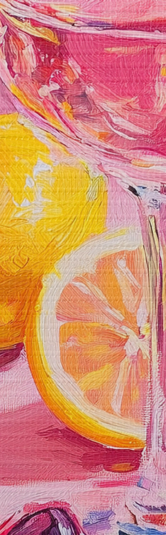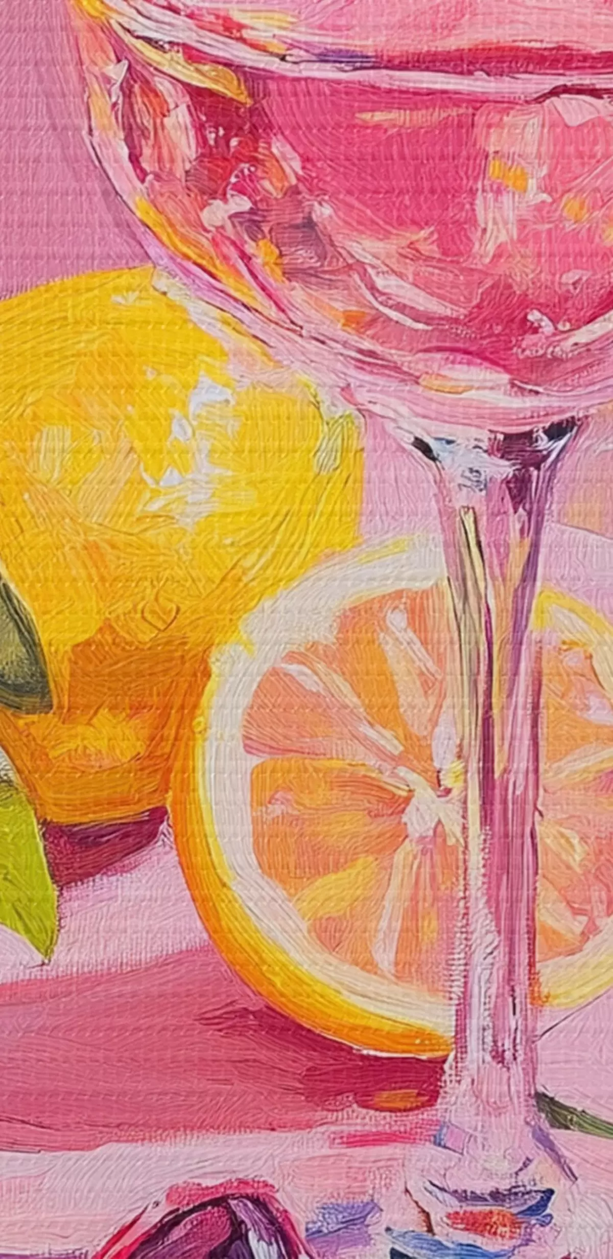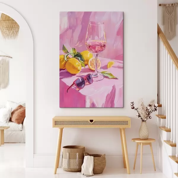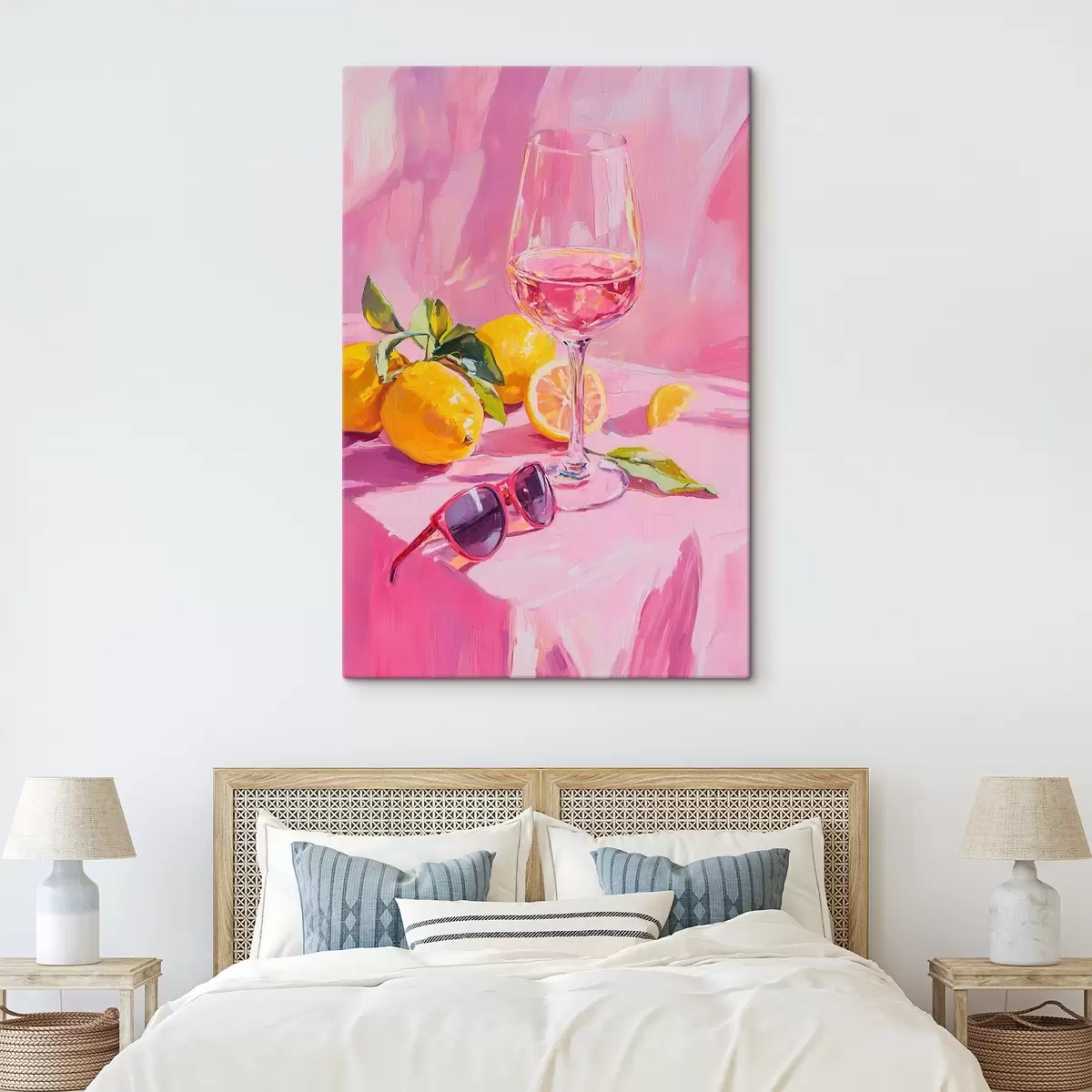 Wandbilder Glas Wein mit Zitronen, Sonnenbrille, Abstraktion, Öl-Stil Zeichnung, rosa Farben Art. s43883