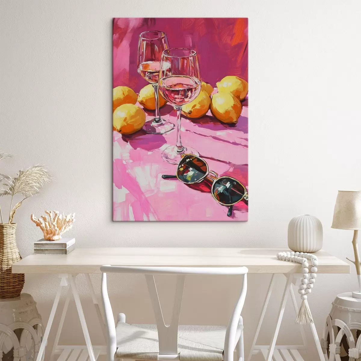 Wandbilder Abstraktion im Ölstil mit Getränkegläsern, Zitronen und Sonnenbrille s43884