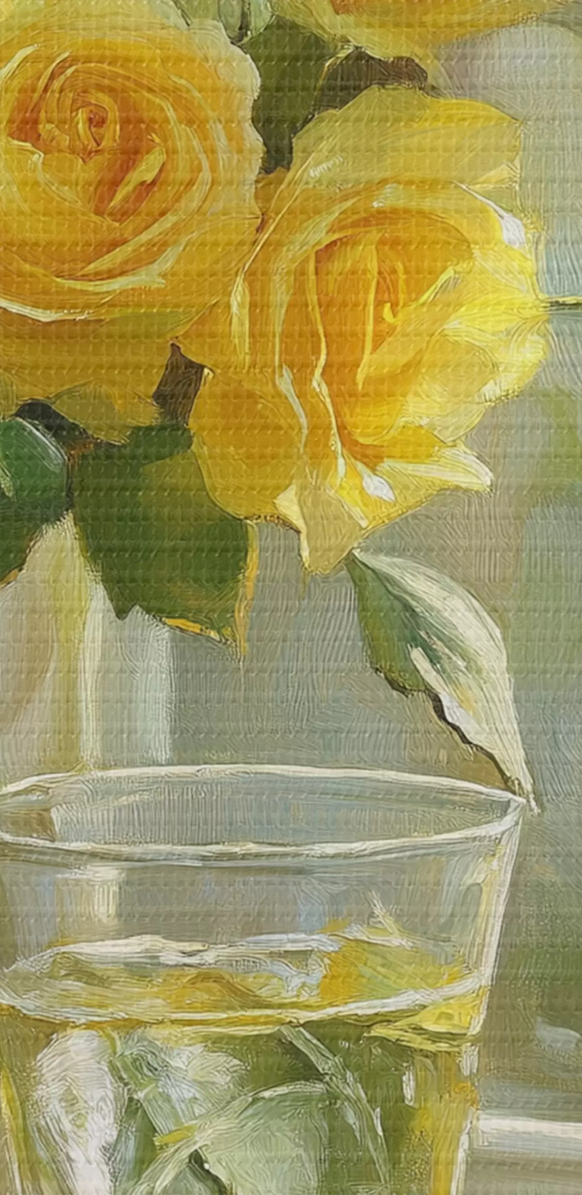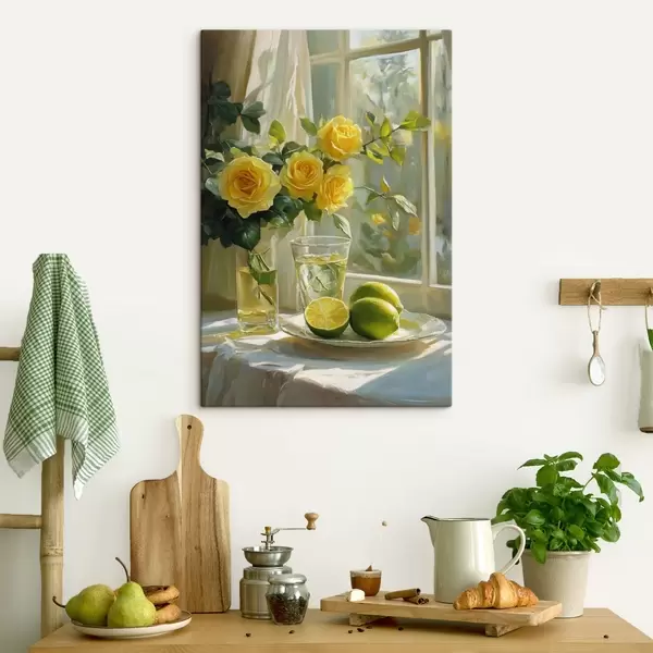 Wandbilder Schöne gelbe Rosen in der Vase neben dem Fenster, Wasser mit Limetten Art. s43886