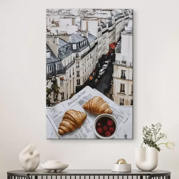 Wandbilder Morgenkaffee mit Croissants, Stadtstraße, architektonisch, Öl-Stil s43891