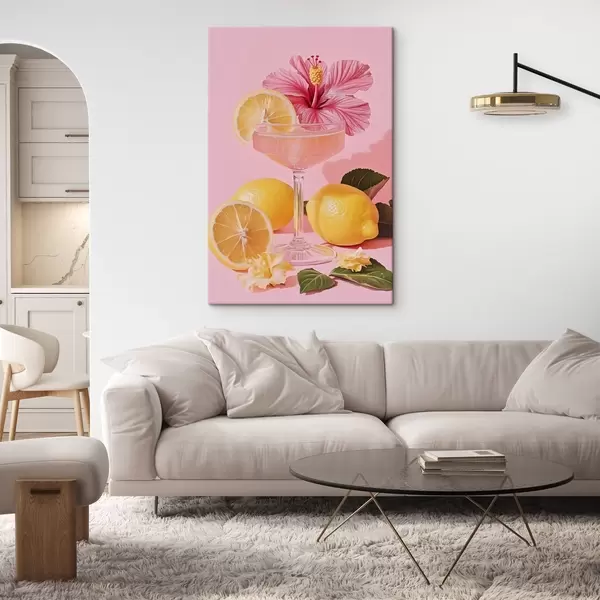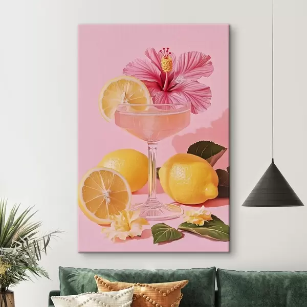 Wandbilder Rosa Cocktail mit Hibiskusblüte, Zitronen, Realismus Art. s43893