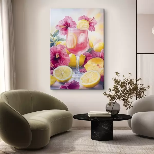 Wandbilder Bunter Cocktail mit Hibiskusblüten und Zitronen, Sommer, Aquarellstil Art. s43894